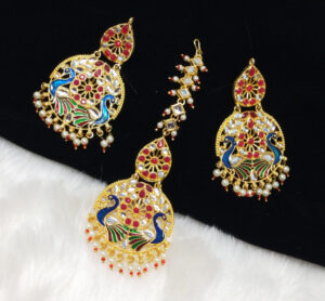 This stunning set features pearl studded Kundan Chandbali earrings and matching Maang Tikka. The intricate design showcases the finest quality Kundan stones and pearls. Perfect for formal occasions, this Kundan set will help you stand out in style.