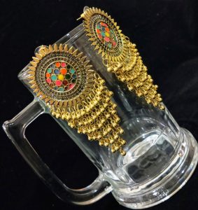 The earrings feature the popular Chand Bali design, which originated in India and is known for its crescent moon shape. This traditional style adds a touch of ethnic elegance to any outfit.