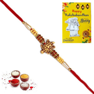 This unique Rakhi features a tortoise and OM design with red AD stones. It’s a beautiful and meaningful gift for your brother, perfect for the auspicious occasion of Raksha Bandhan.