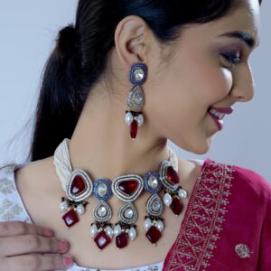 Elevate your style with this statement piece, designed to capture attention and leave a lasting impression. The deep crimson hue of the pearls creates a bold and enchanting look, making it the perfect accessory for special occasions. Immerse yourself in the opulence of tradition and the modern elegance of this meticulously crafted Red Pearl Kundan…