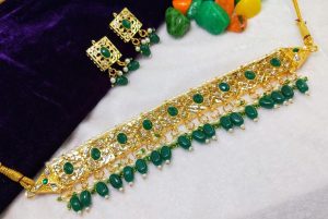 Step into a world of enchantment with our Enchanting Green Pearl Kundan Choker Jewellery Set. Meticulously crafted with meticulous care and attention to detail, this set is a true masterpiece that exudes elegance and allure.