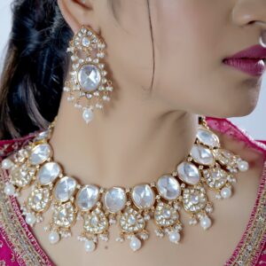 Our Elegant Jadau Jewelry Set is a testament to India’s rich heritage of artistry and adornment. This set embodies sophistication and opulence, making it the ideal choice for those seeking timeless beauty and tradition.