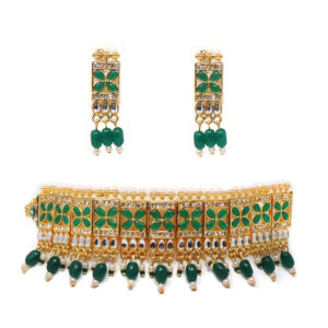 Introducing our Gold Plated Green Pearl Choker Set, a perfect fusion of elegance and charm. Crafted with precision, it features lustrous green pearls on a gold-plated choker. This stunning set adds allure and glamour to any outfit. Elevate your style with this captivating jewelry piece.