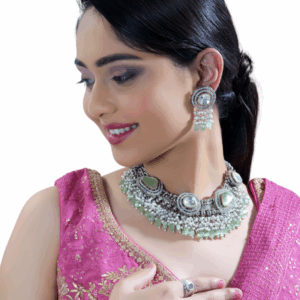 Elevate your style with the Green Pearl Uncut Polki Kundan and CZ Jewelry Set. This silver-plated Kundan Polki design seamlessly blends elegance and innovation, featuring signature white stones in a unique arrangement. The blooming halo surrounding the center stone and earrings brings a traditional touch, making it a versatile and timeless accessory that complements traditional,…