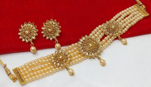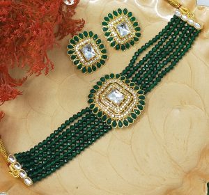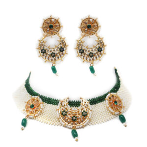 Experience a poetic allure with our luxurious handcrafted gold plated white green pearl choker jewelry set. Adorned with exquisite pearls and bedecked with timeless gold, this jewel set will make you stand out with its elegance and craftsmanship, reflecting the unforgettable chapters of your life.