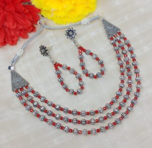 The Multi-Layered Oxidized Jewelry Set exudes a captivating blend of contemporary design and vintage charm. Its intricate layers add depth and allure to the overall look. The oxidized finish imparts a unique and eye-catching appeal. This versatile set is perfect for various occasions, offering comfort and elegance in one stunning piece.