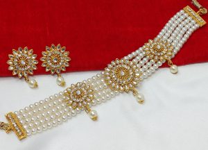 Enhance your neckline with the exquisite Kundan Studded Multistrand Pearl Choker Necklace Set. This captivating ensemble combines the timeless beauty of lustrous pearls with the regal charm of Kundan accents. Crafted with meticulous attention to detail, this set exudes elegance and sophistication. Elevate your style and make a statement with this extraordinary piece of jewelry.
