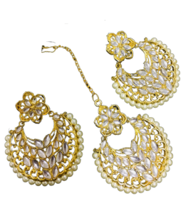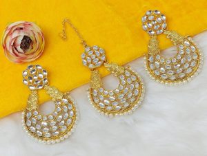 Our Elegant Kundan Maangtika Earrings with Gold Plating are a reflection of traditional craftsmanship. Intricately detailed and plated with radiant gold, these timeless earrings will add a touch of sophistication and elegance to any ensemble. Perfectly suited for special occasions, these earrings are sure to make you stand out. Â