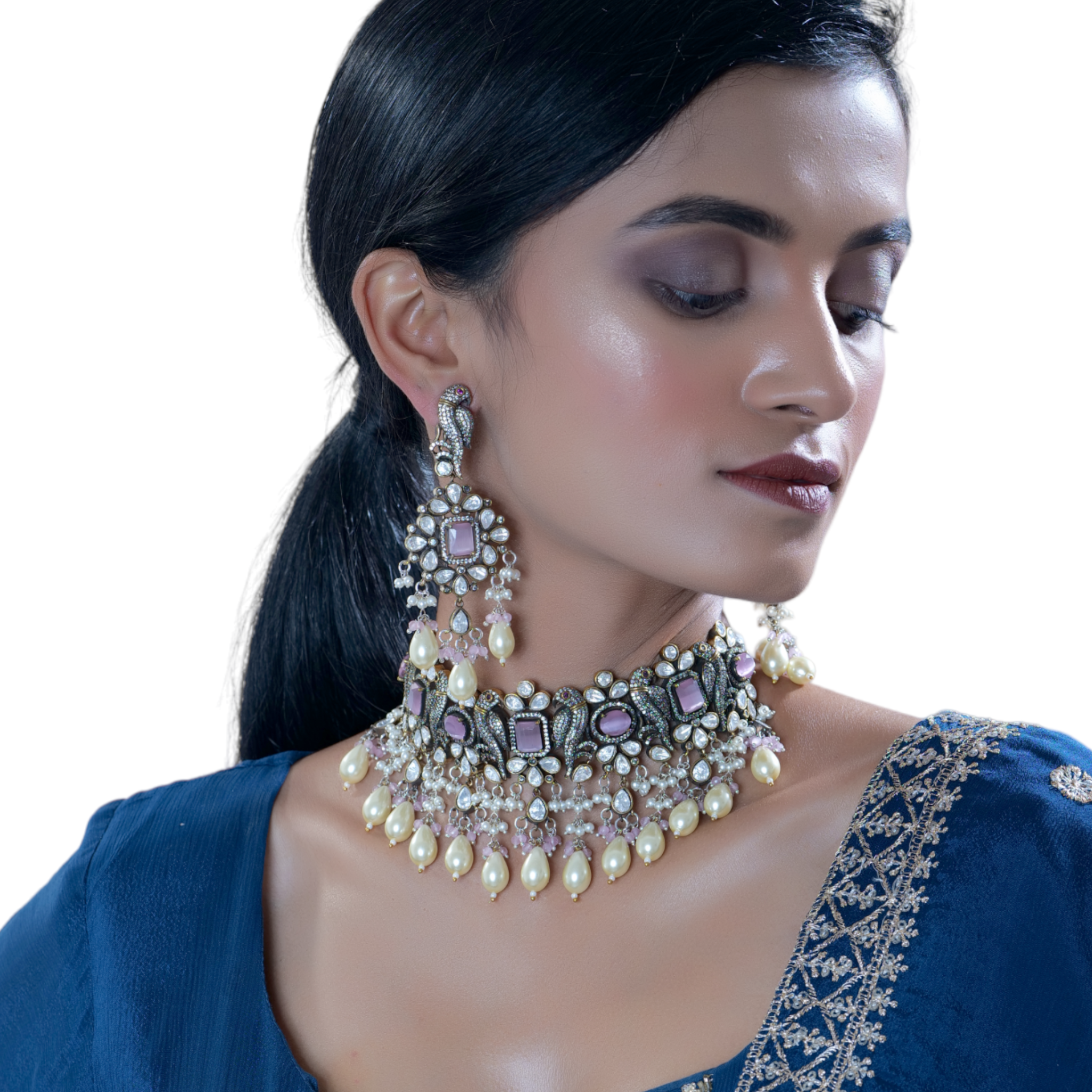 Antique Gold Pink Polki Pearl CZ Studded Choker Jewellery Set