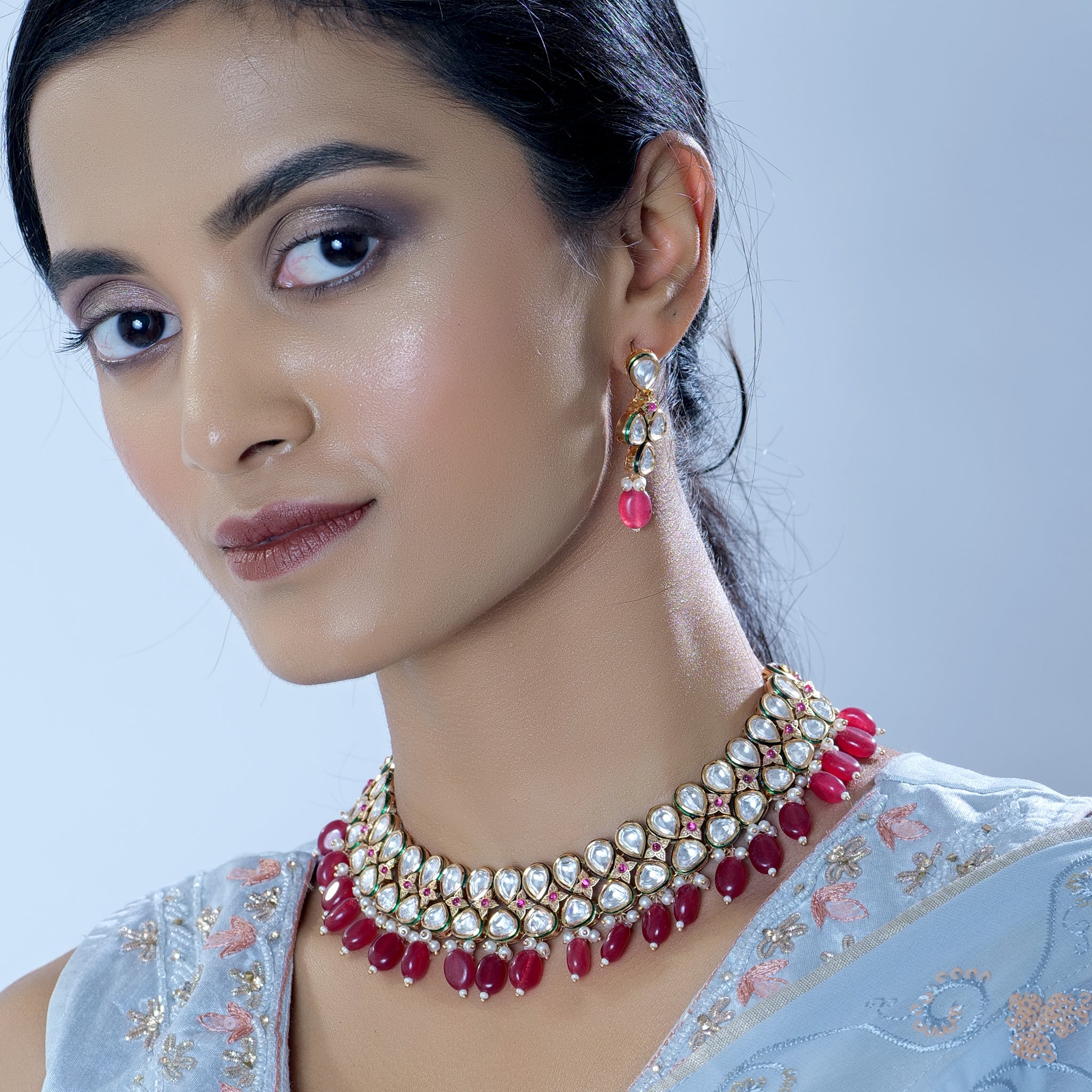Elevate your style with this statement piece, designed to capture attention and leave a lasting impression. The deep crimson hue of the pearls creates a bold and enchanting look, making it the perfect accessory for special occasions. Immerse yourself in the opulence of tradition and the modern elegance of this meticulously crafted Red Pearl Kundan Choker Jewelry Set.