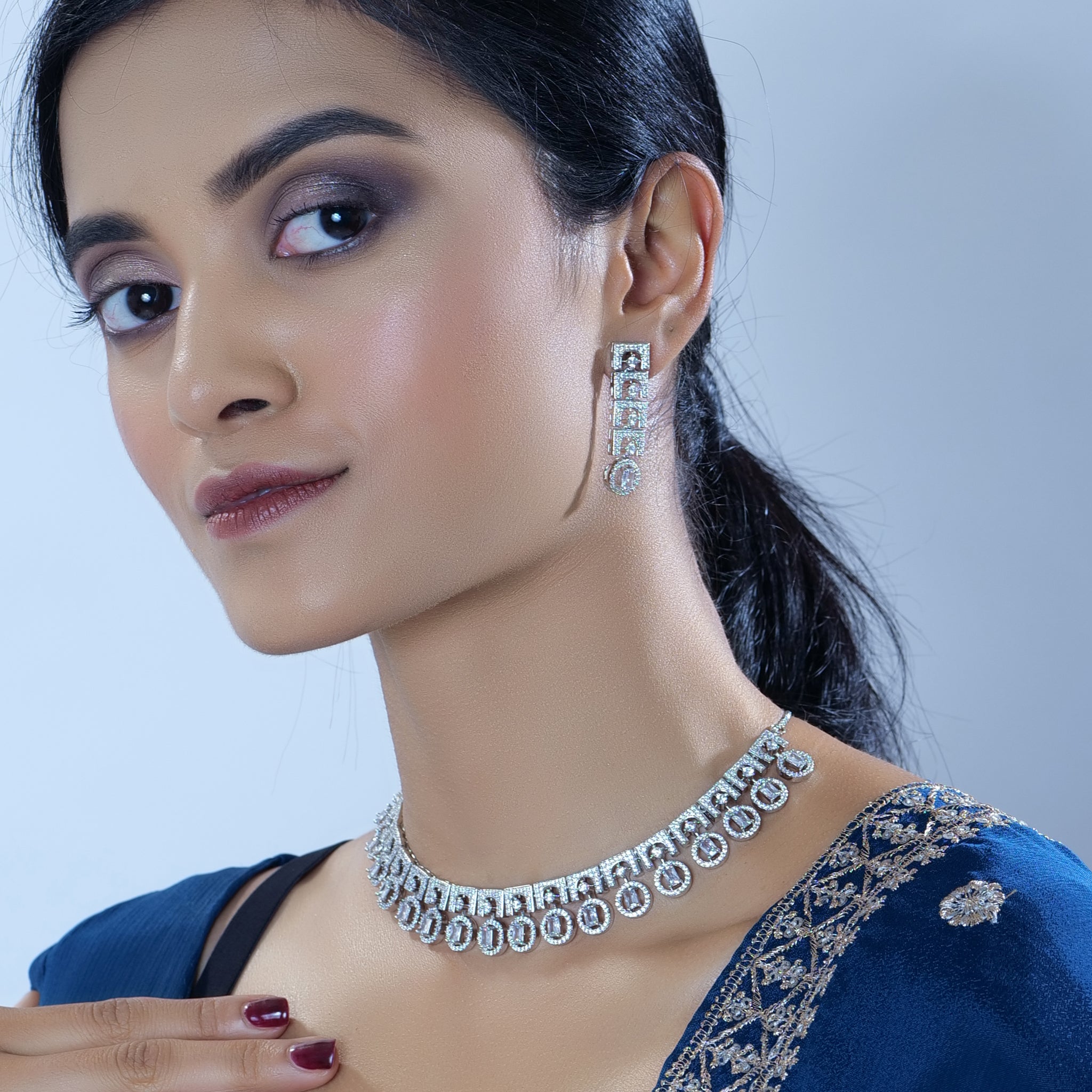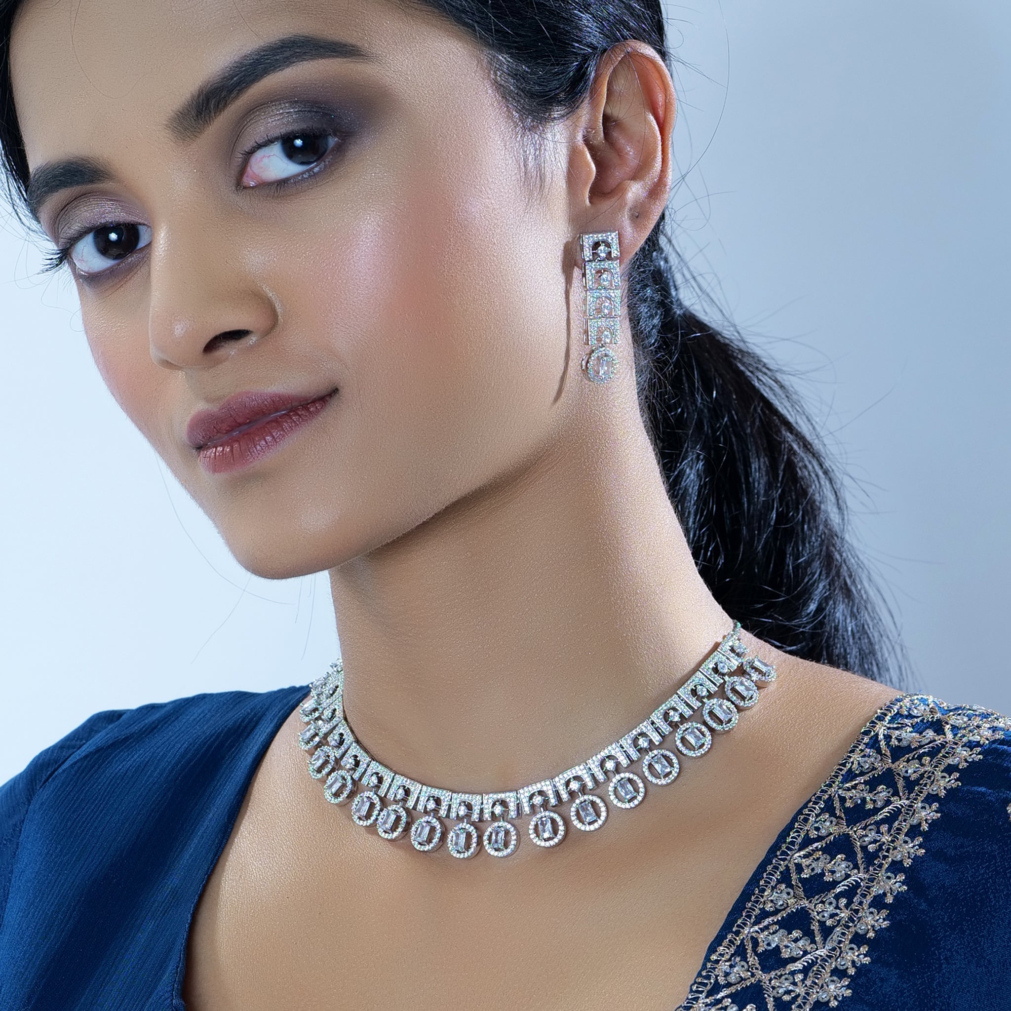 This luxurious CZ Cubic Zircon Necklace Set is crafted with silver plating and features an intricate cubic zircon-studded necklace and a pair of beautiful earrings. Securely fastened with a drawstring closures, the set will add a glamorous touch to your elegant saree or salwar suit or with evening gown. Perfect for your wedding functions, this high-end jewellery set is a great choice for adorning with contemporary or traditional designs.