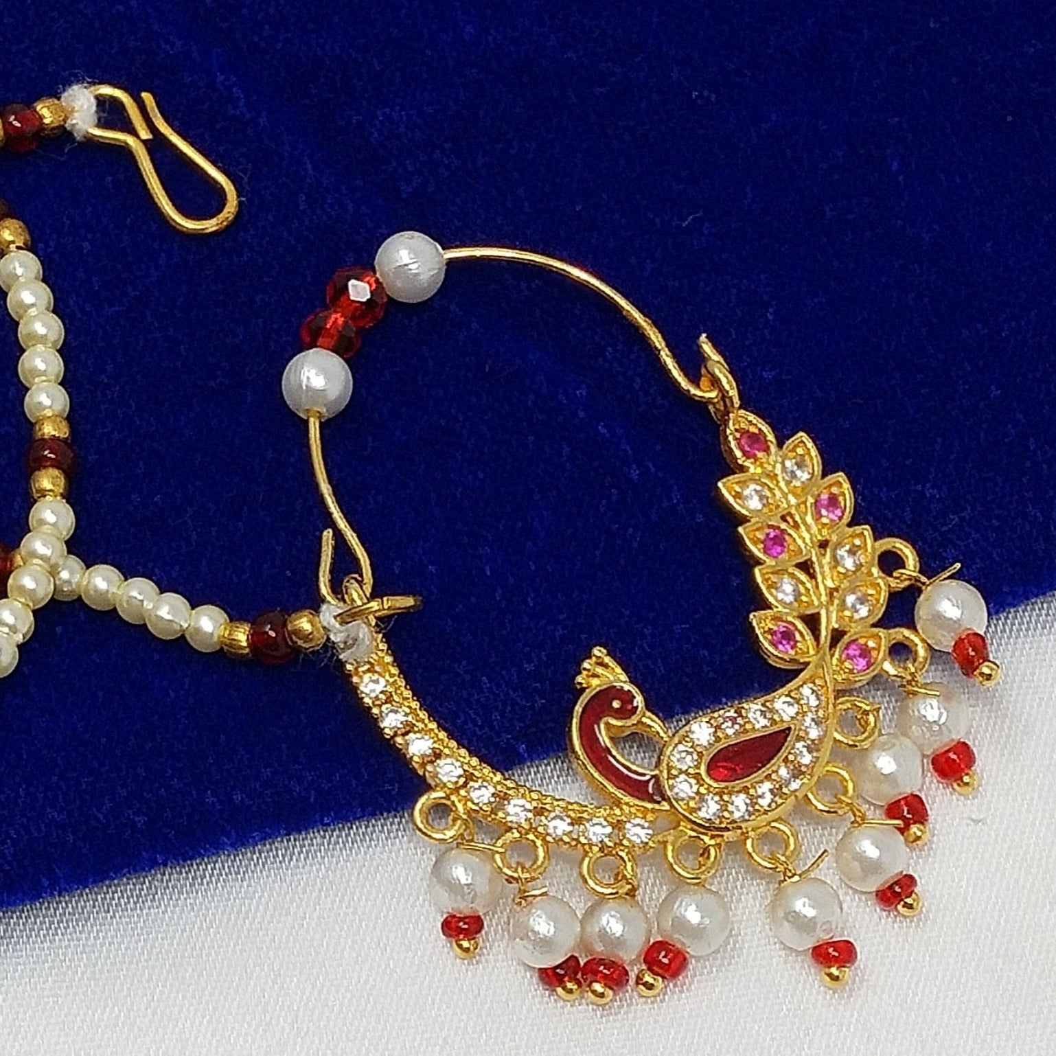 This Diamond Pearl Chain Nose Ring is a luxurious and elegant accessory. Its perfect for special occasions with a combination of a genuine red stone, zircon and a freshwater pearl on a pearl chain with a peacock dangling nath. The kundan nose press pin is handmade with a traditional Indian bridal nathni for an extra touch of glamour.