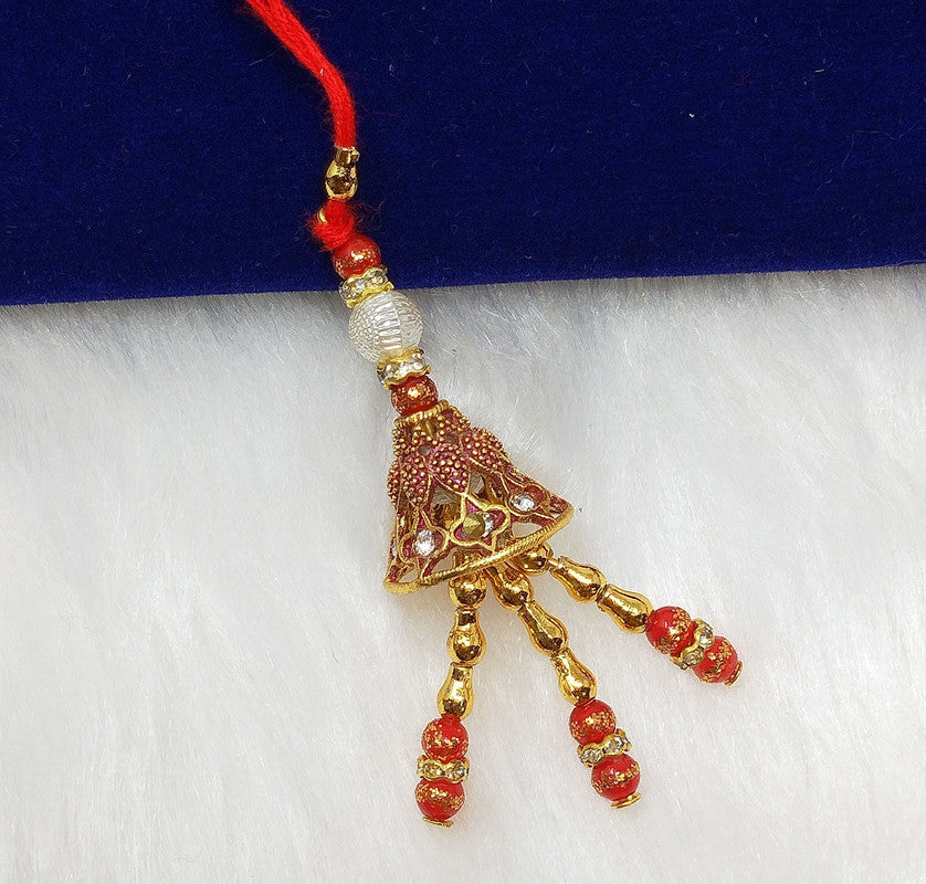 The Ethnic Red Jhumkha Bhabhi Lumba Rakhi is bold and beautiful. Featuring ethnic red jhumkhas, this Rakhi adds a vibrant pop of color, perfect for those who love lively and festive designs. The intricate detailing and traditional craftsmanship make it a standout piece.