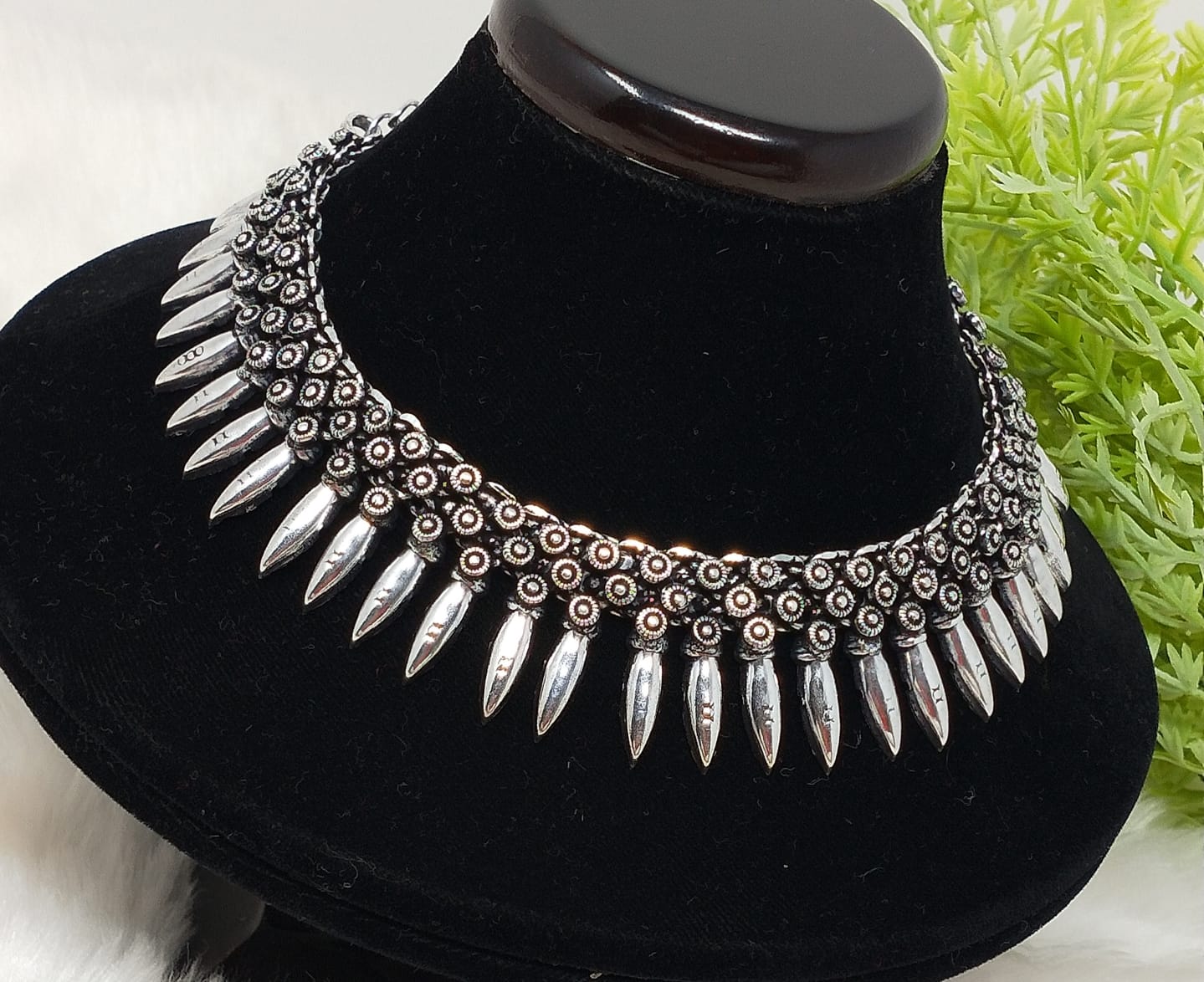 Introducing our German Silver Stylish Choker Necklace – a timeless piece that exudes classic sophistication. Crafted with lightweight German silver material, this necklace offers both comfort and style, making it a versatile addition to your jewelry collection.
