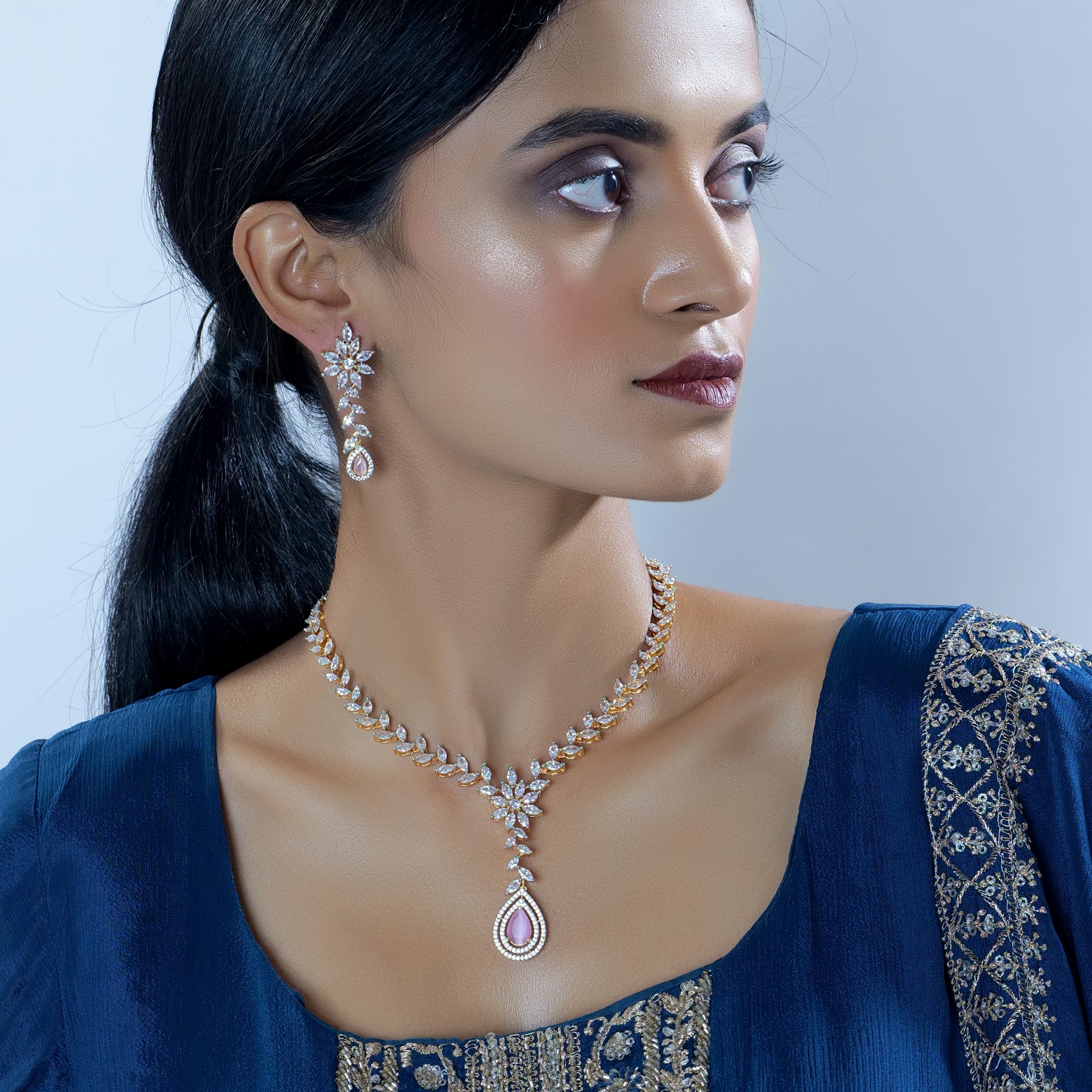 This luxurious CZ Cubic Zircon Necklace Set is crafted with silver plating and features an intricate cubic zircon-studded necklace and a pair of beautiful earrings. Securely fastened with a drawstring closures, the set will add a glamorous touch to your elegant saree or salwar suit or with evening gown. Perfect for your wedding functions, this high-end jewellery set is a great choice for adorning with contemporary or traditional designs.