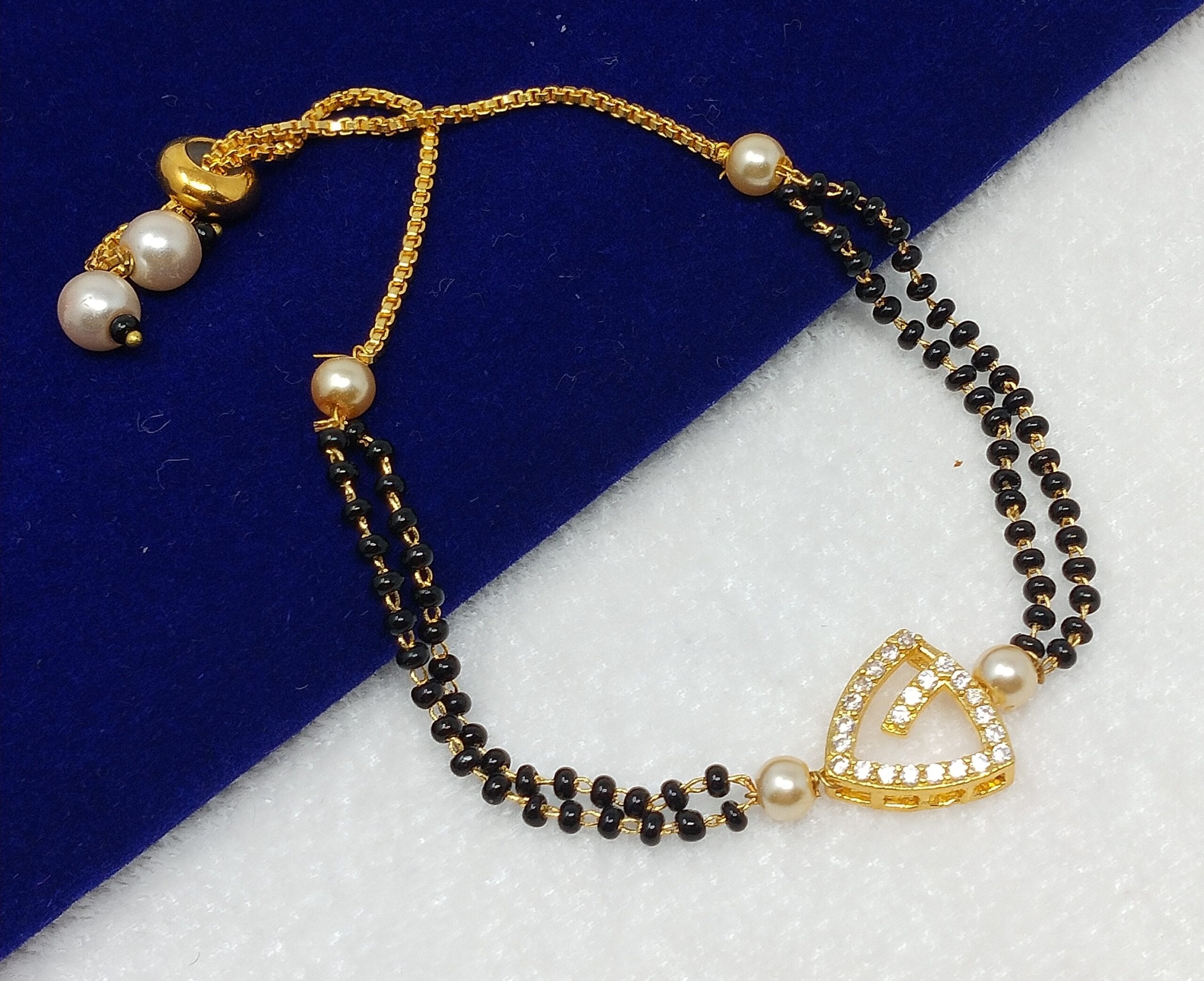 “Embrace the allure of our Gold Plated Hand Bracelet Mangalsutra, a fusion of tradition and modern elegance. Elevate your look and celebrate your bond with this exquisite marriage symbol.”