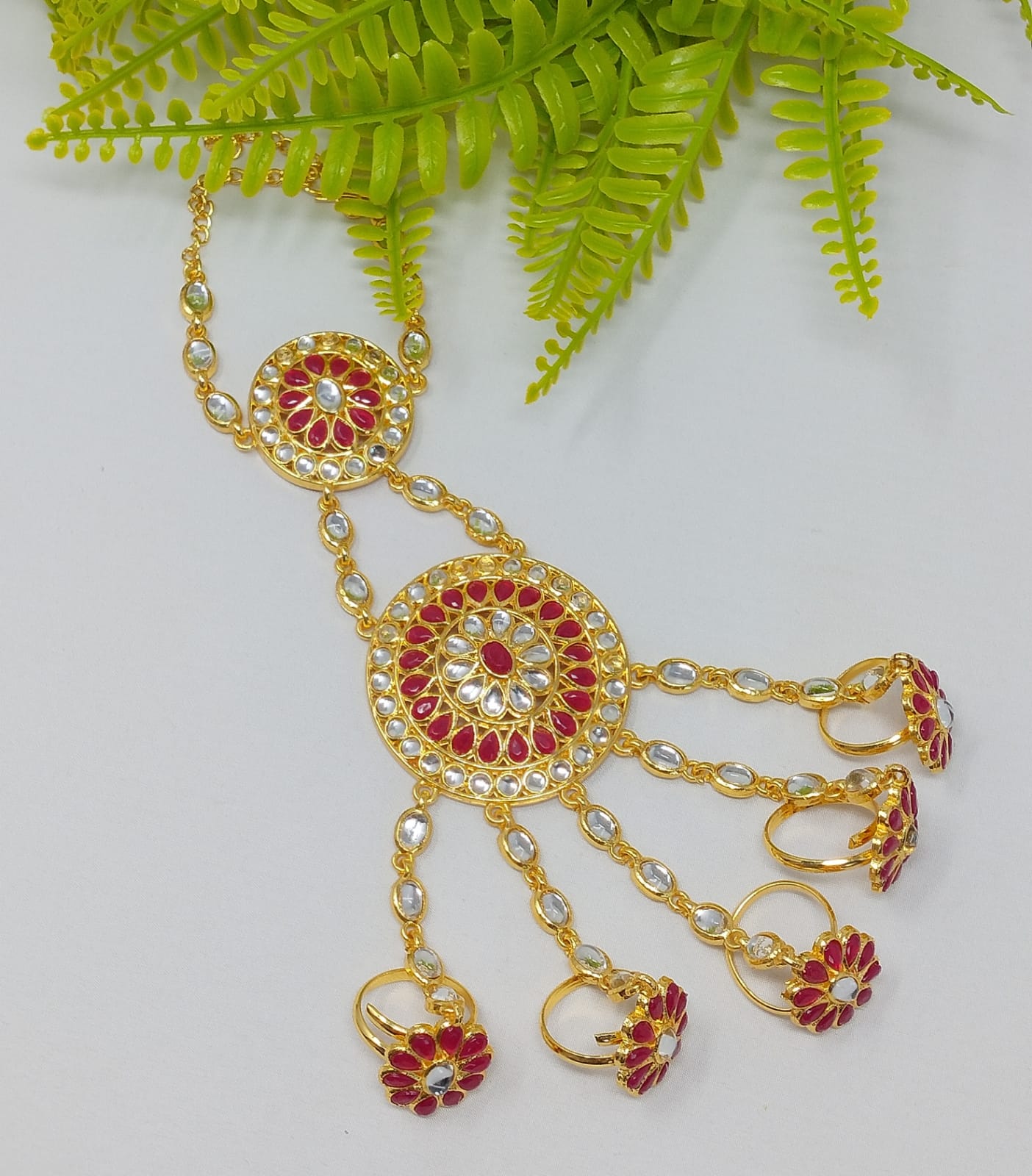 Gold Plated Kundan Finger Chain Hath Phool Bracelet