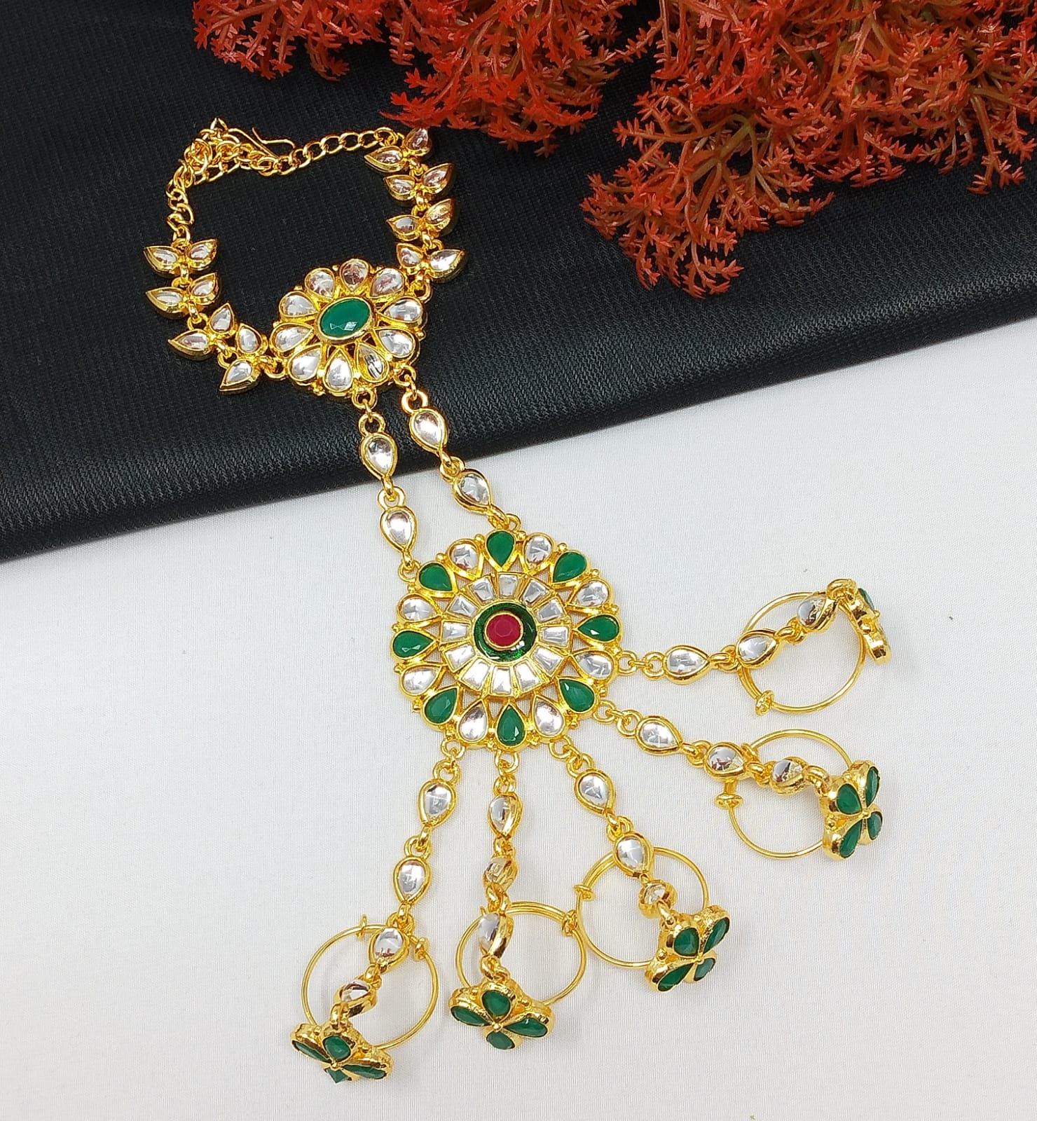 Take the plunge and let your style sparkle with our Gold Plated Kundan Hath Panja Ring Bracelets. Luxuriously crafted and elegantly designed, these bracelets sparkle and shine – daring you to make a statement! Ready for a dazzling adventure? Start here!