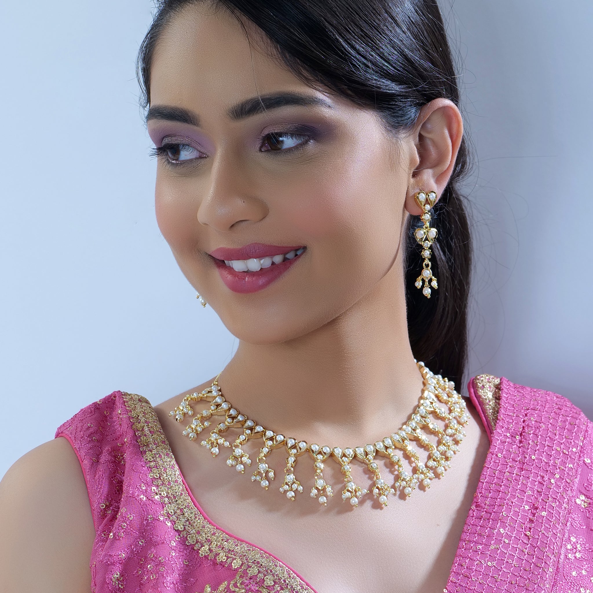 Gold Plated Pearl Studded Jadau Necklace Set