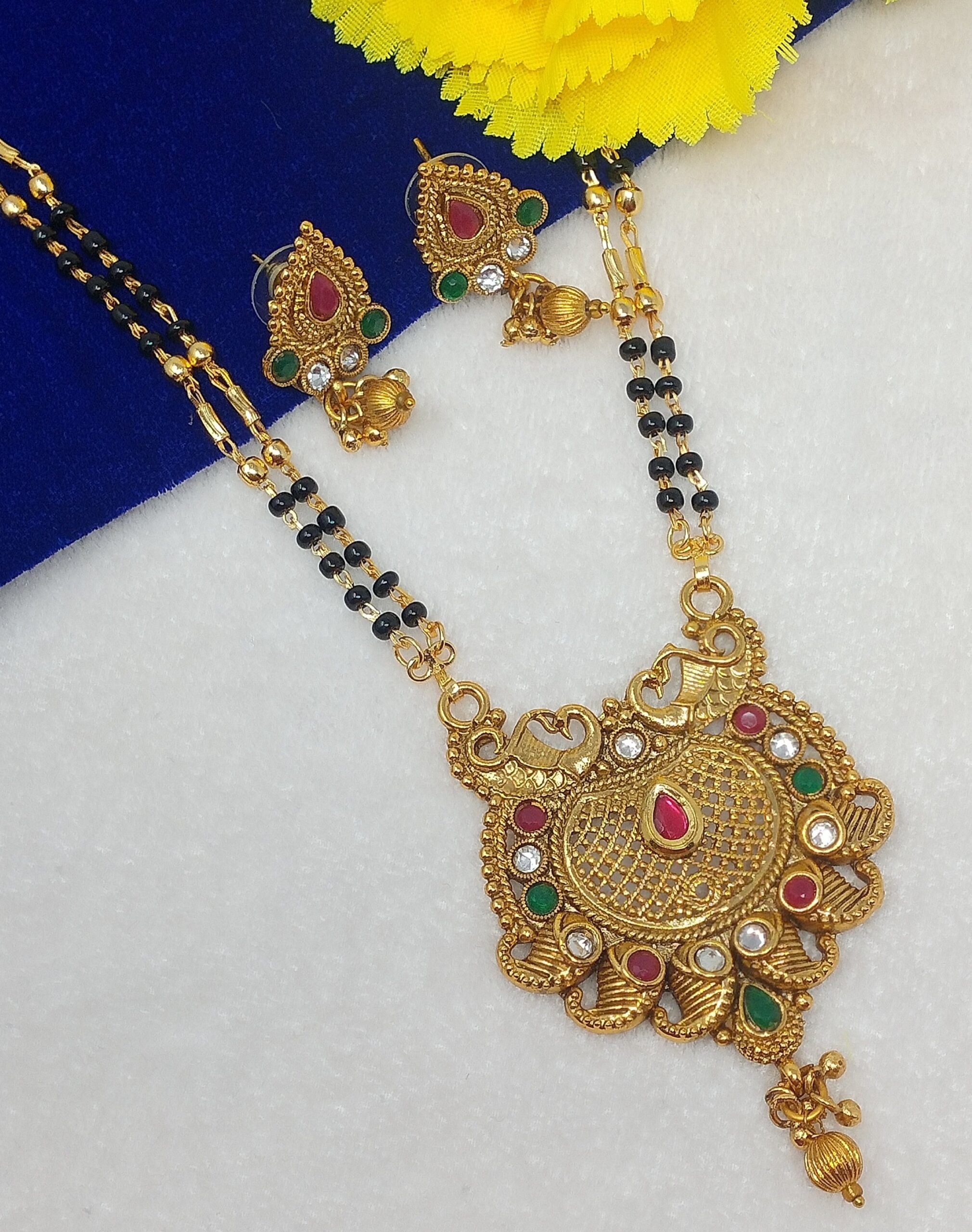 Our Gold Plated Traditional Mangalsutra features sacred symbolism with black beads for protection and a pendant coated in radiant gold. Crafted with delicacy, it’s comfortable for daily wear and complements both traditional and modern outfits. An elegant and thoughtful gift symbolizing love and commitment.