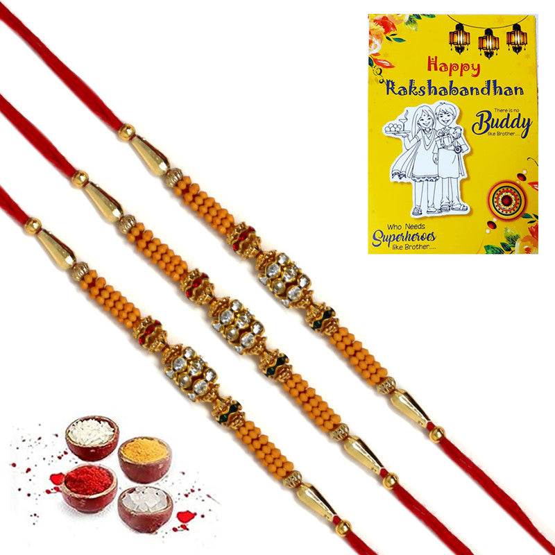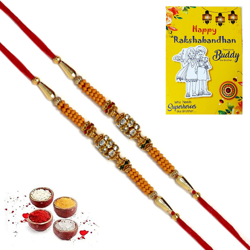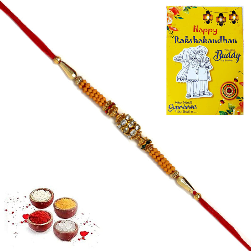 Featuring golden and red AD stones with pearls, this Rakhi is a stylish and elegant gift for your brother. Perfect for celebrating Raksha Bandhan, it adds a touch of sparkle to the festivities