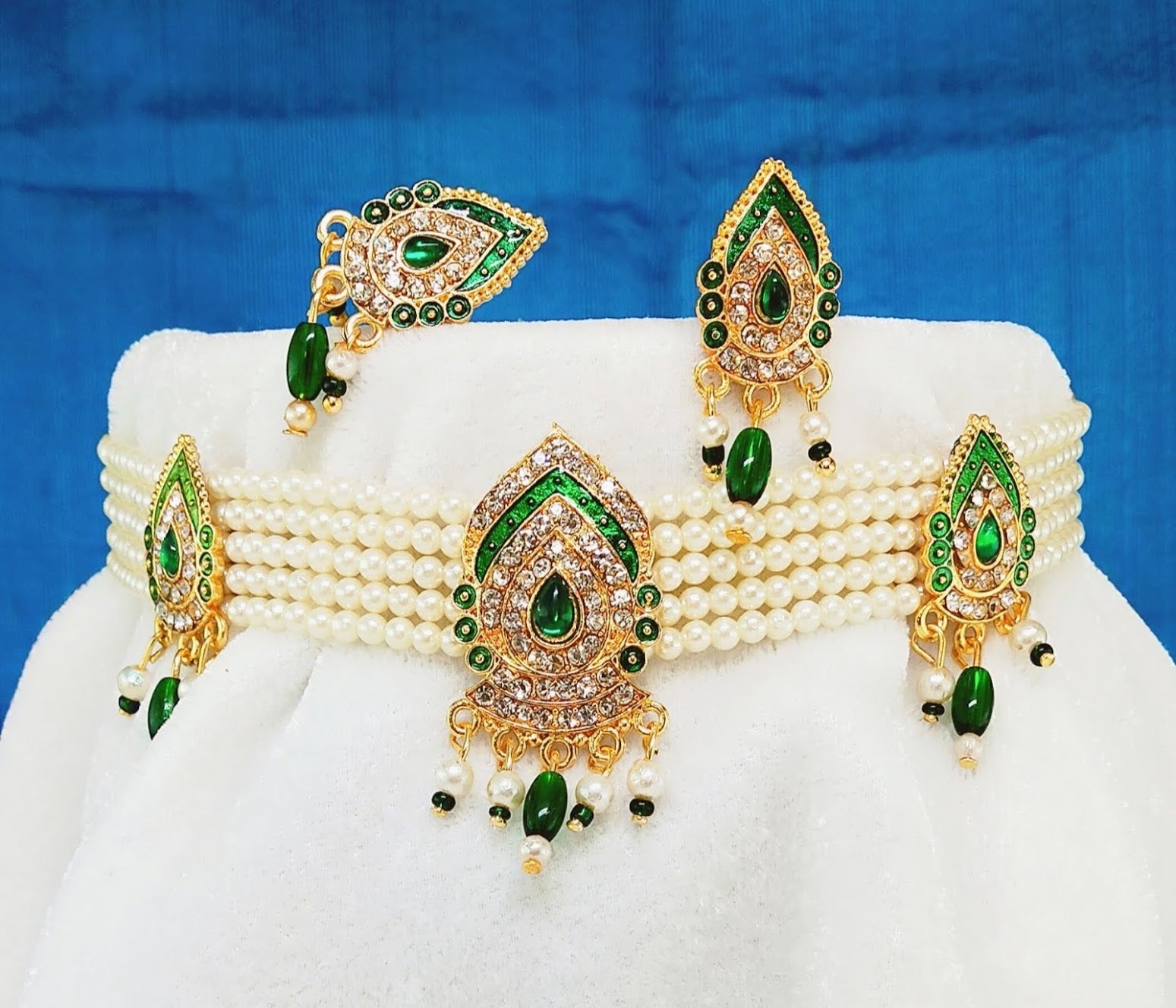 This elegant Green AD Pearl Moti Choker Jewelry Set is the perfect way to add a touch of sophistication to any outfit. Featuring a timeless design made of Green AD Pearl, this set will make an eye-catching statement for any occasion.