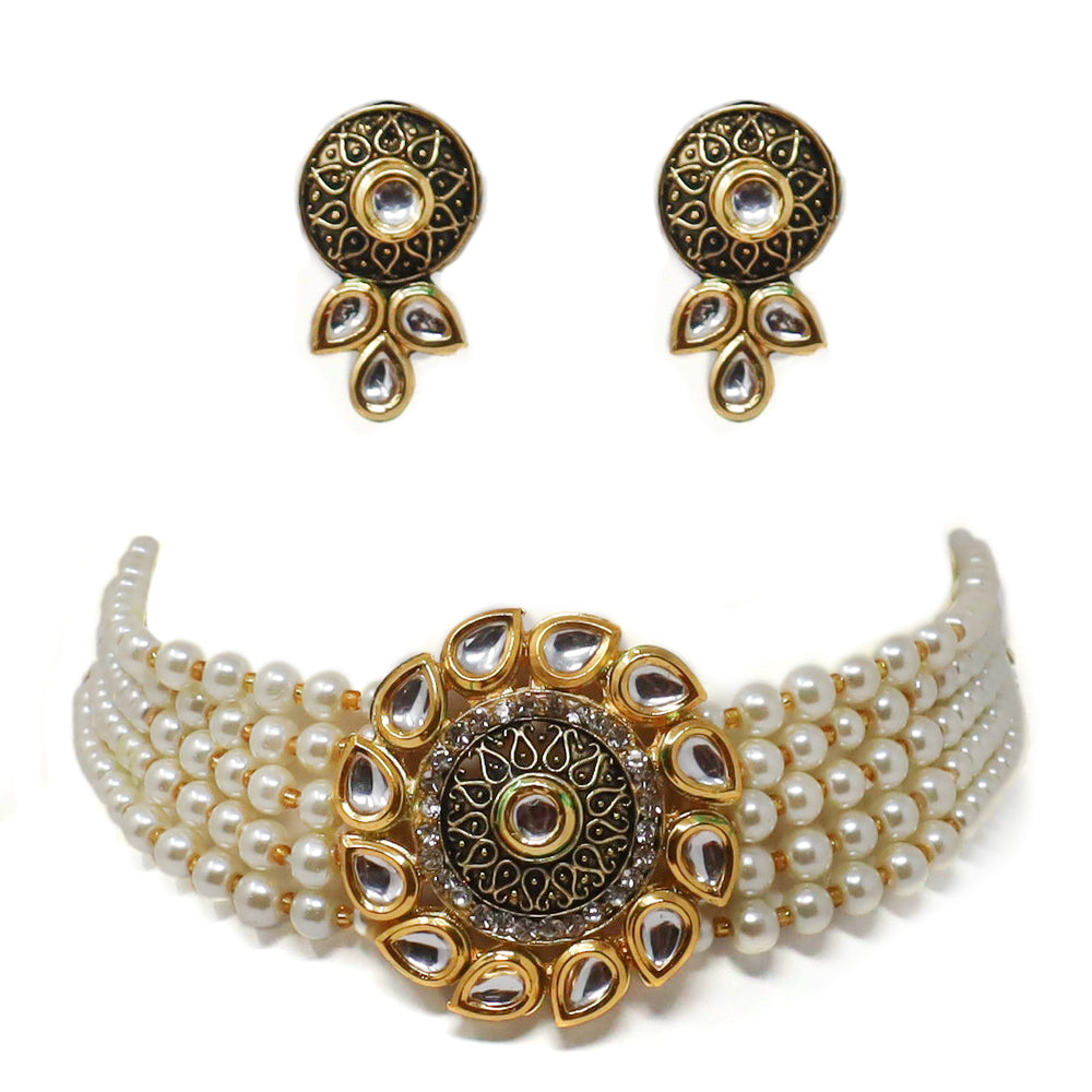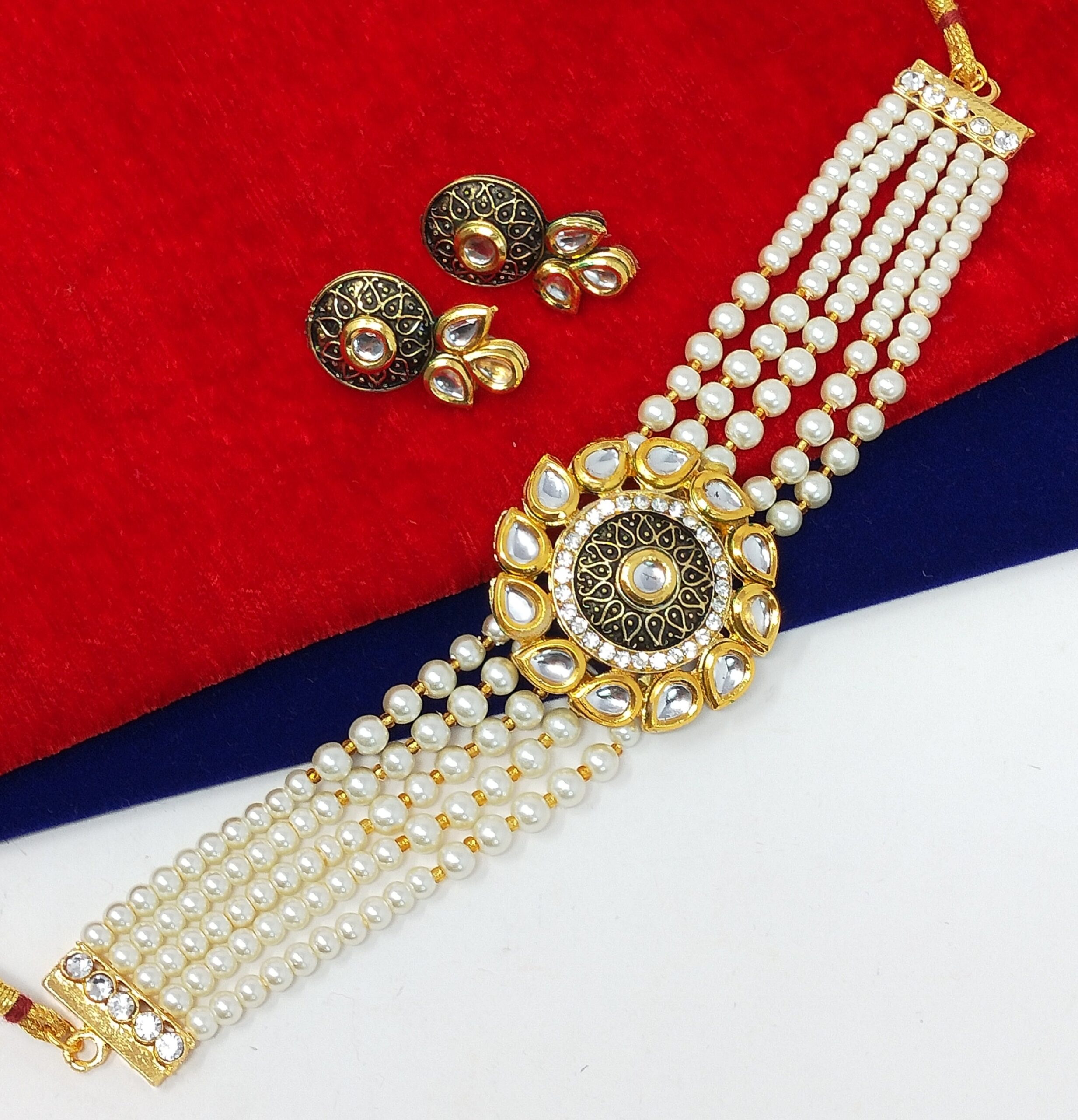 Kundan Studded Multistrand Pearl Choker Necklace Set
