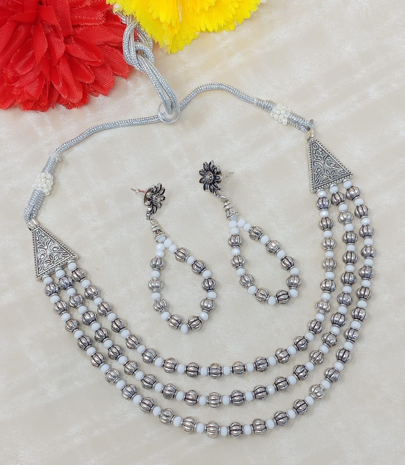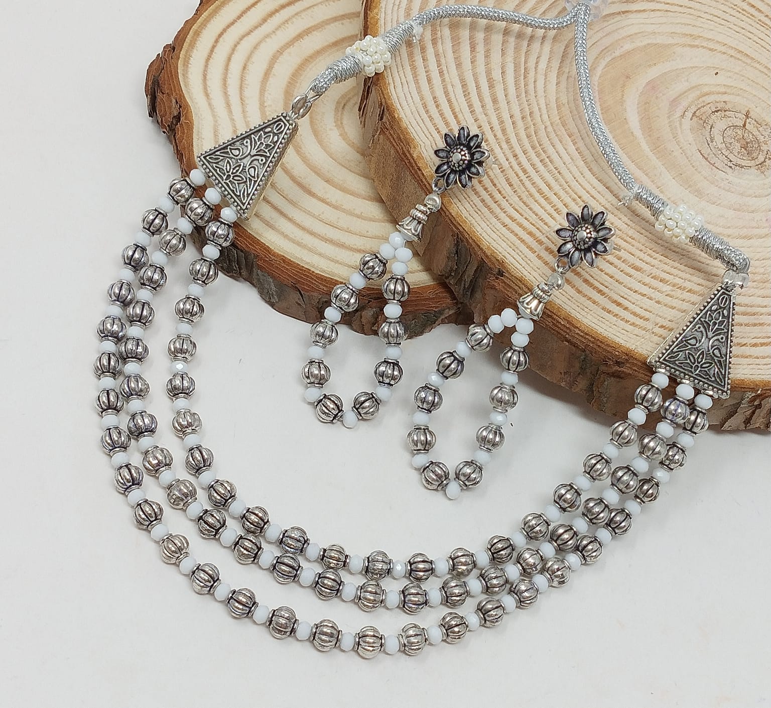 The Multi-Layered Oxidized Jewelry Set exudes a captivating blend of contemporary design and vintage charm. Its intricate layers add depth and allure to the overall look. The oxidized finish imparts a unique and eye-catching appeal. This versatile set is perfect for various occasions, offering comfort and elegance in one stunning piece.