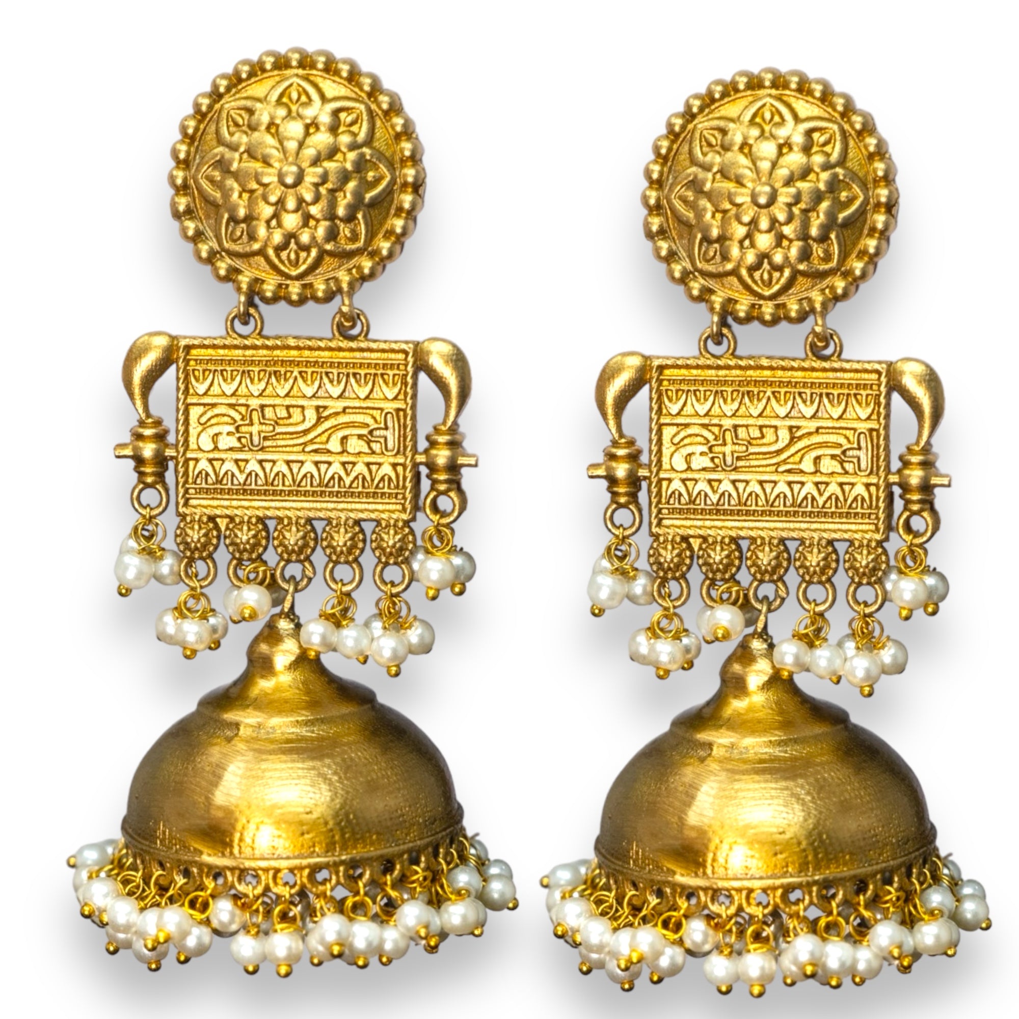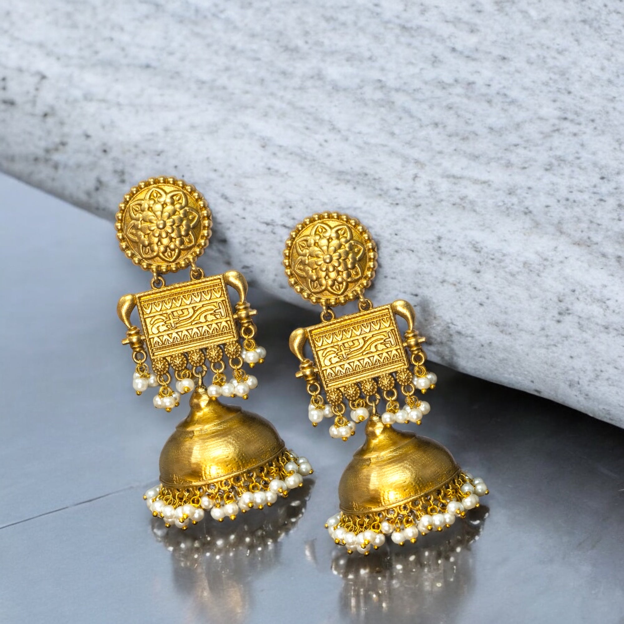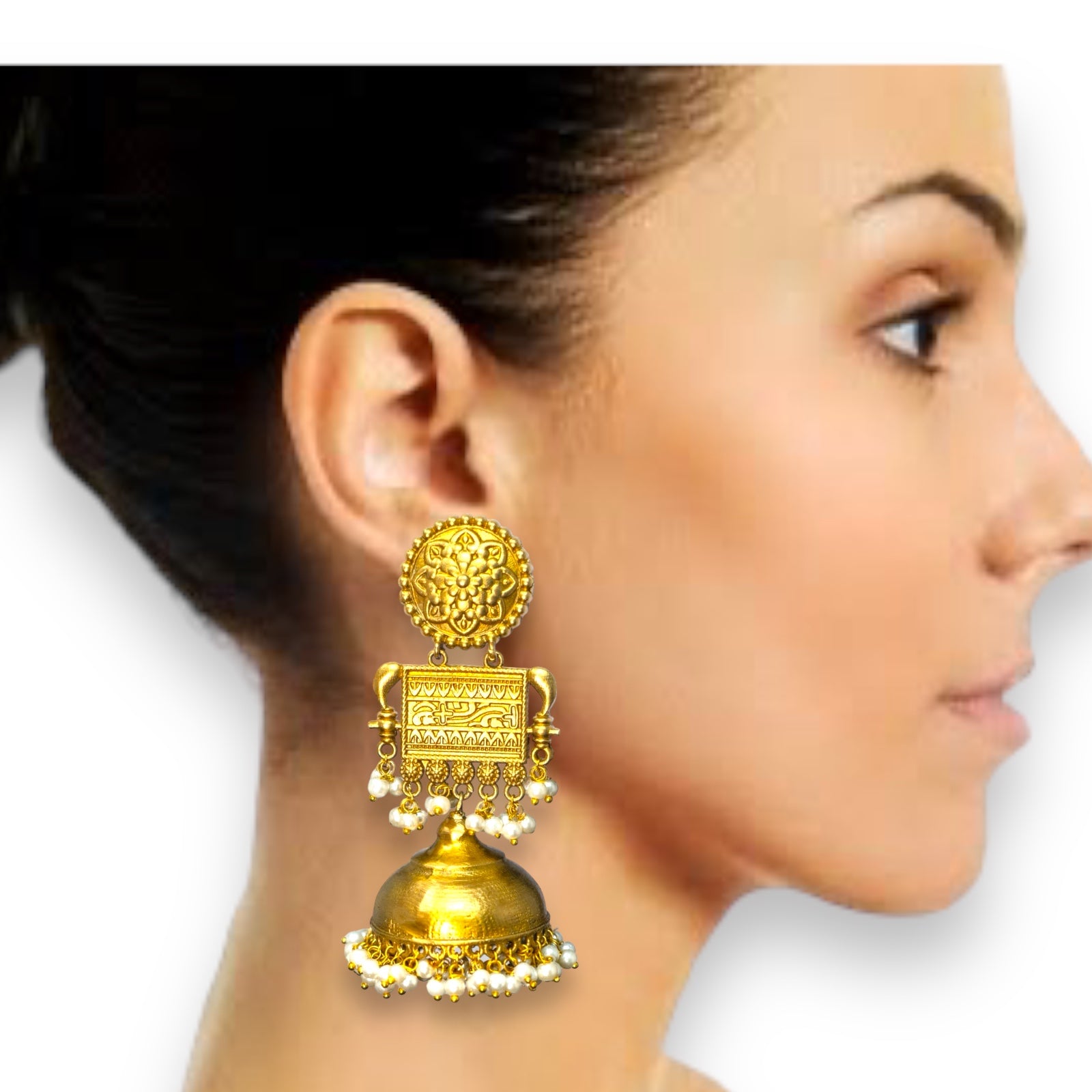 Elevate your ensemble with our Long Gold Plated Jhumka Earrings for Women and Girls. These statement earrings add a touch of elegance to any outfit. With their stunning gold plating and intricate design, they are sure to turn heads and make you feel confident and beautiful. Perfect for any occasion, these earrings are a must-have for any jewelry collection.