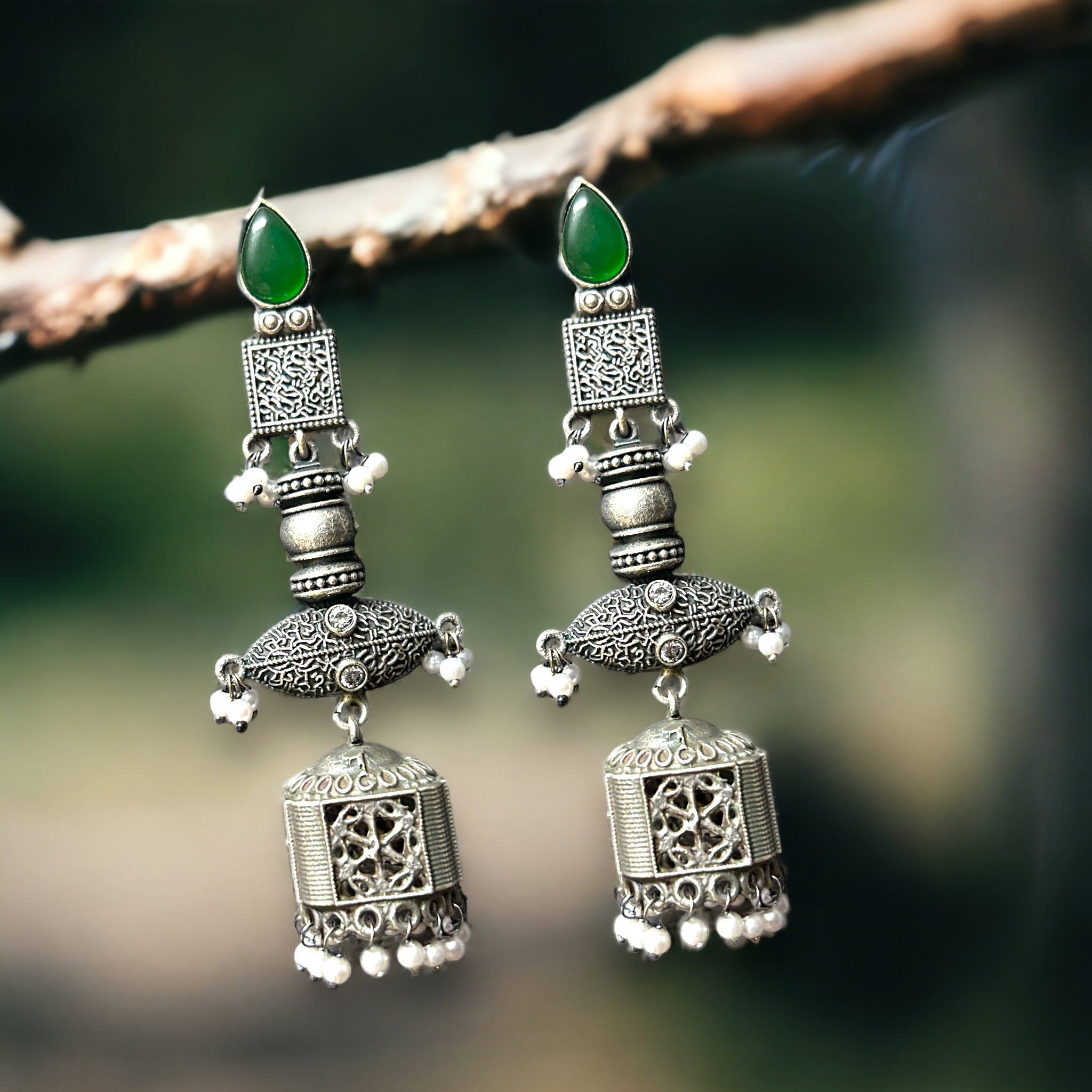 Discover the allure of our Oxidized German Silver Long Jhumka Earrings – a fusion of traditional charm and contemporary style. These exquisite earrings are meticulously crafted from high-quality German silver, featuring a stunning oxidized finish that adds a touch of vintage elegance to your ensemble.