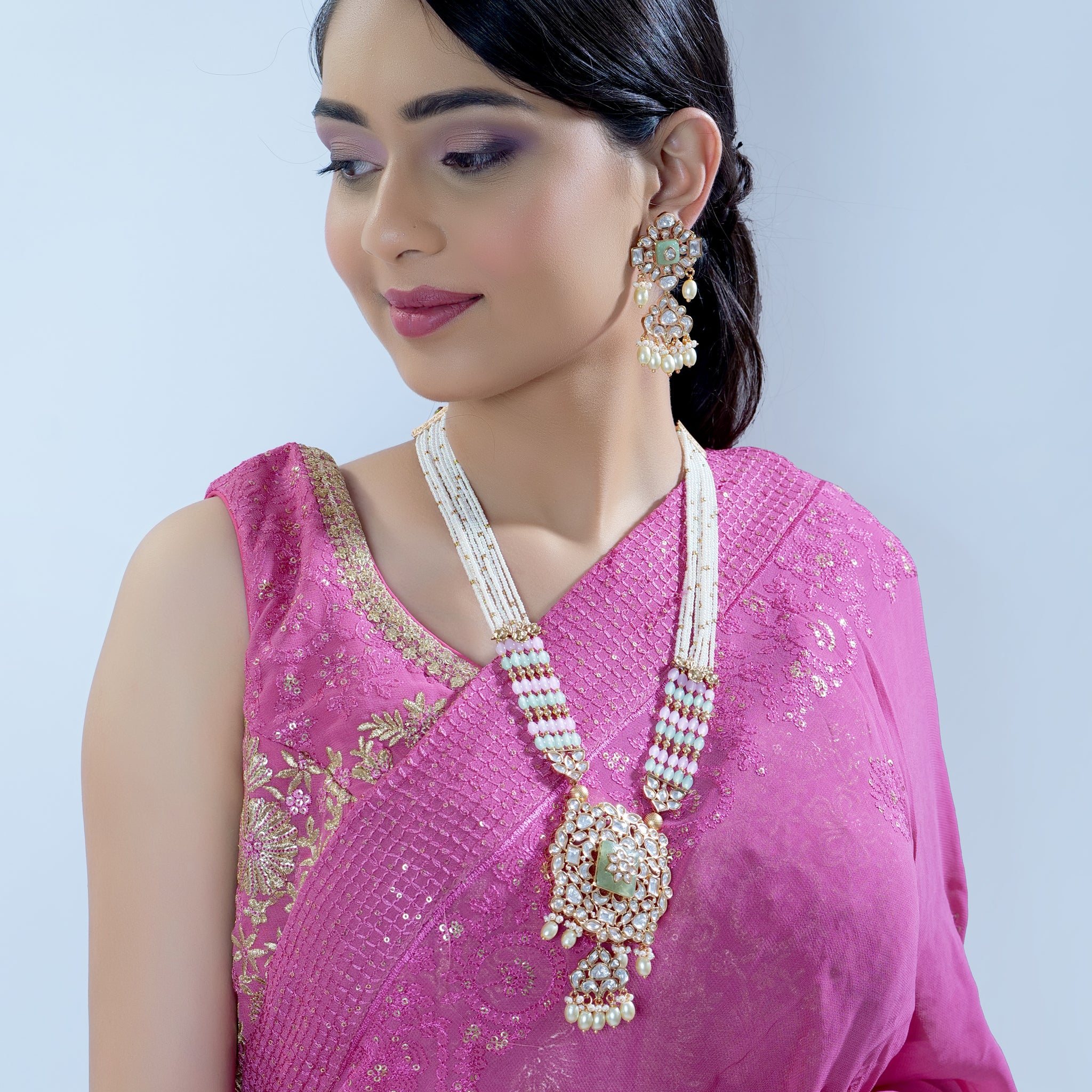 Indulge in regal sophistication with our Kundan Pearl Long Jewelry Set. This exquisite ensemble features intricately set Kundan stones, exuding timeless charm. The elongated design, adorned with lustrous pearls, adds a touch of elegance, making it a perfect accessory for special occasions.