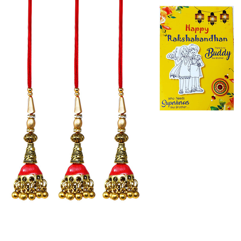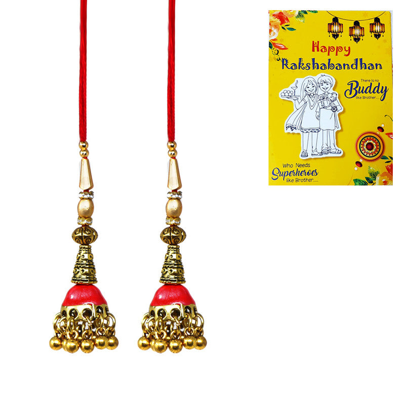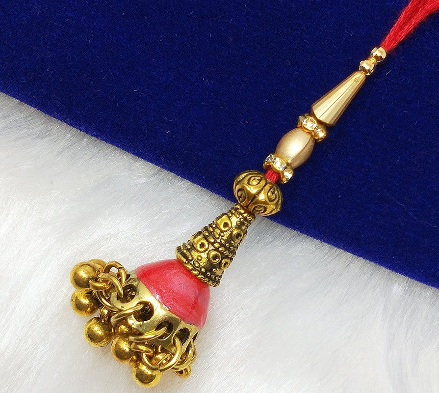 The Red Meenakari Work Lumba is vibrant and artistic. Adorned with detailed red meenakari work, this Rakhi captures the festive spirit and adds a touch of glamour. Its bold and colorful design makes it a perfect choice for those who love lively and eye-catching accessories.