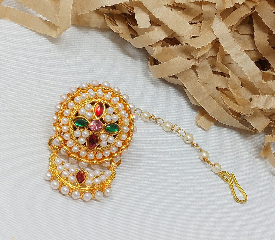 Adorn yourself with the classic beauty of our Rajputi Borla Maang Tikka. Infused with the elegance of Rajasthani artistry, it’s a symbol of timeless grace.