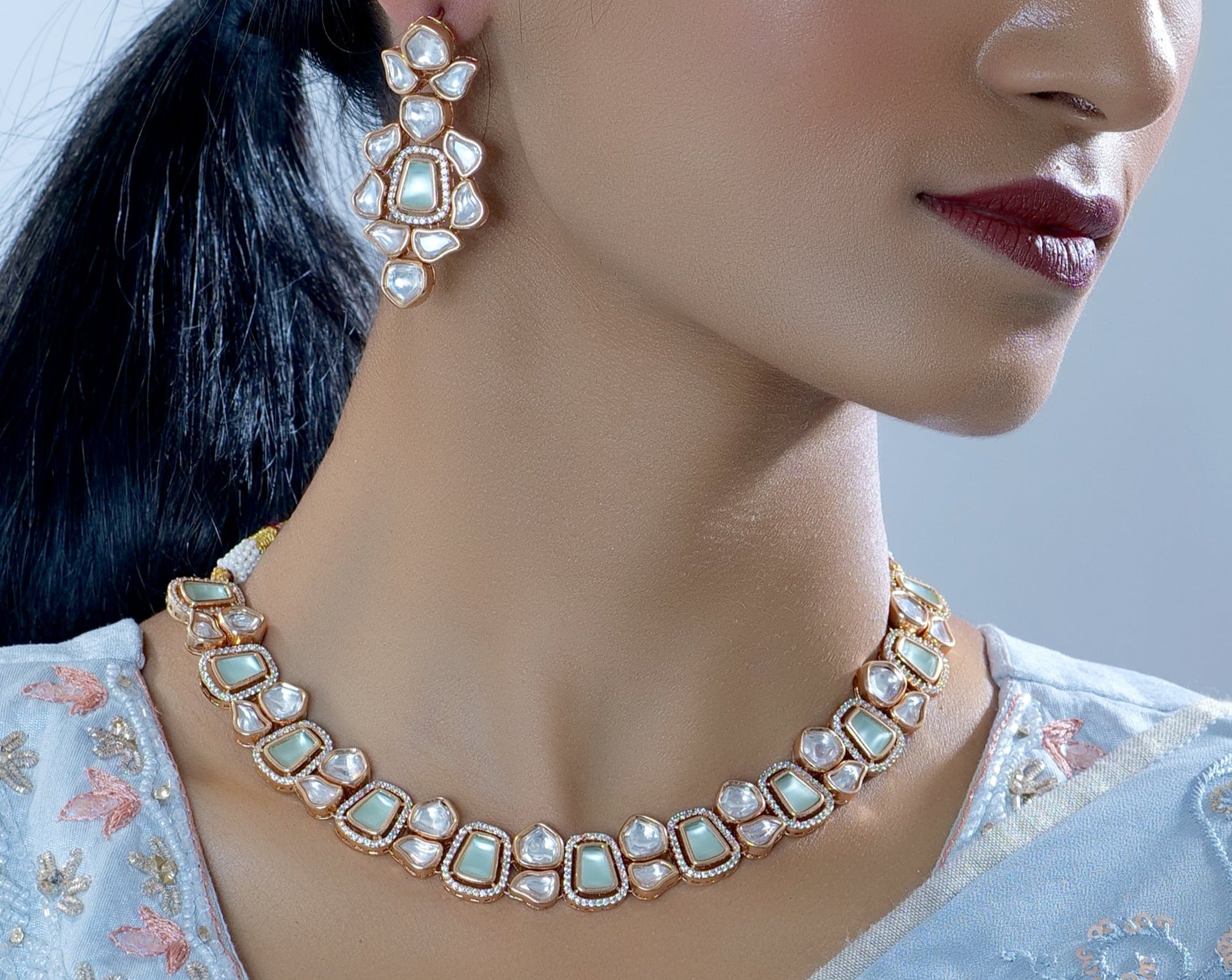 Rose Gold Plated CZ Studded Uncut Polki Kundan Jewelry Set