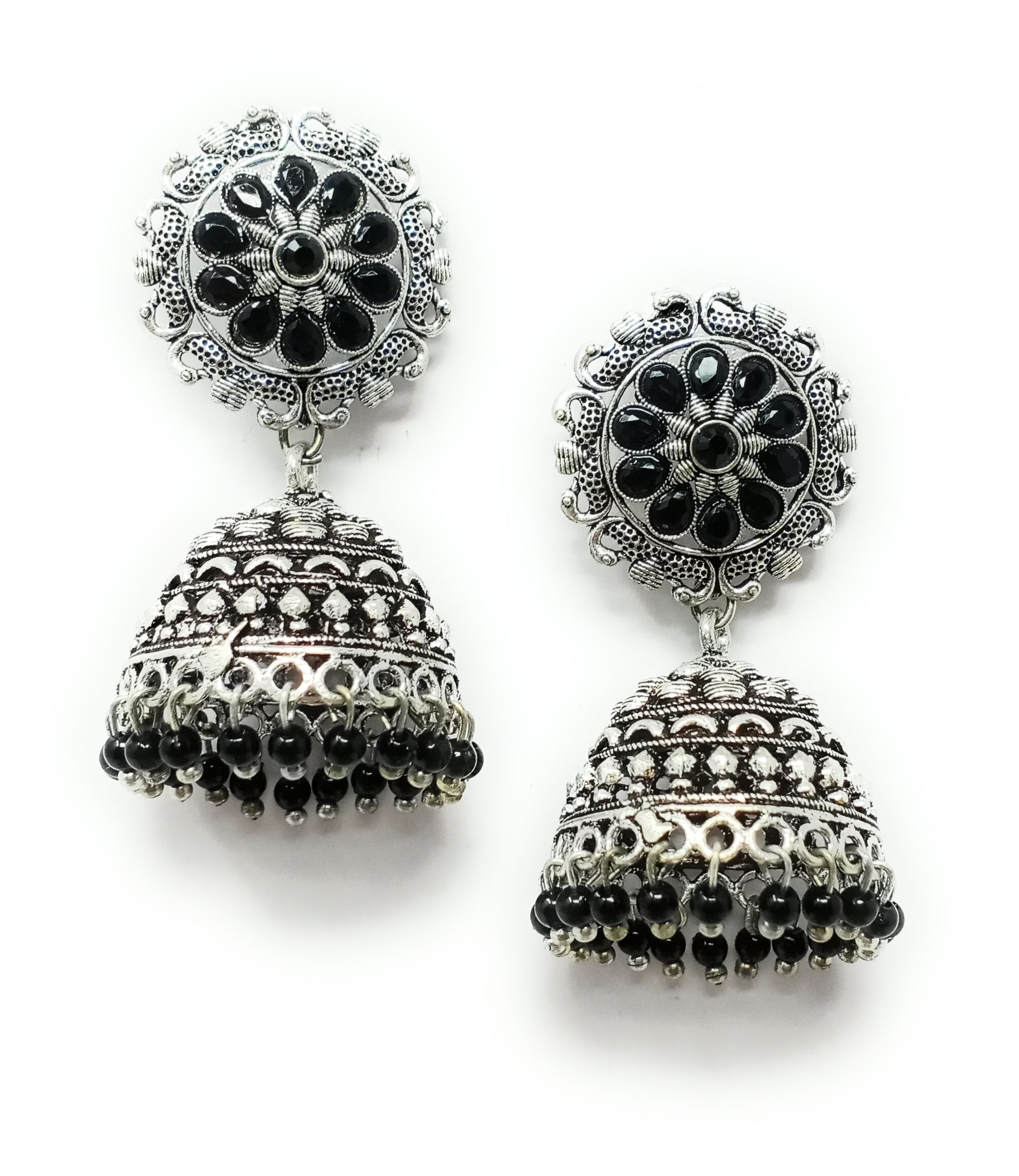 Look elegant and sophisticated with these stunning Silver Plated Oxidized Jhumki Earrings. Crafted from silver-plating and oxidized for a luxurious finish, they will instantly add grace and glamour to any look.