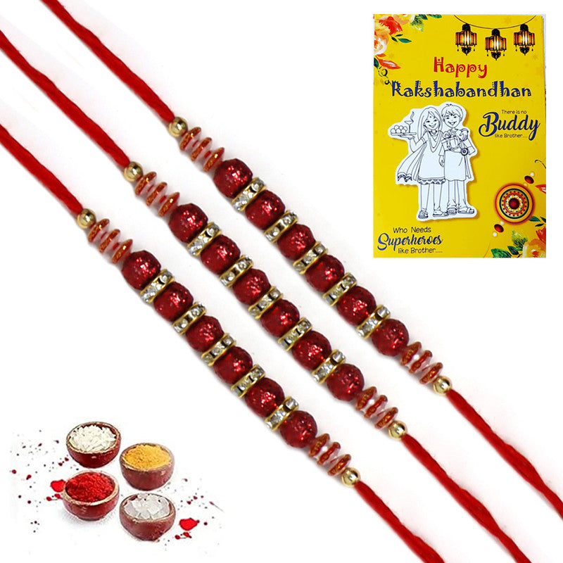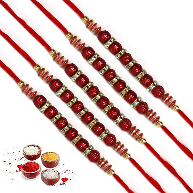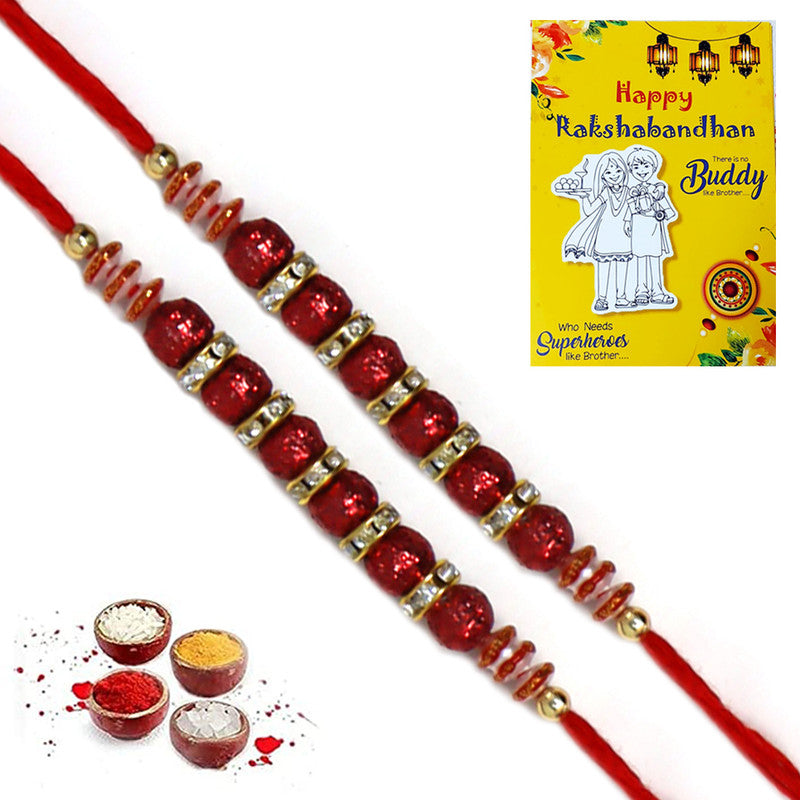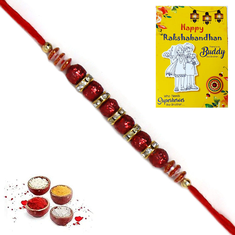 Celebrate Raksha Bandhan with this Sparkle Red Beads Rakhi, designed to add a touch of glamour to your brother’s wrist. This Rakhi is both stylish and meaningful, making it an ideal gift.