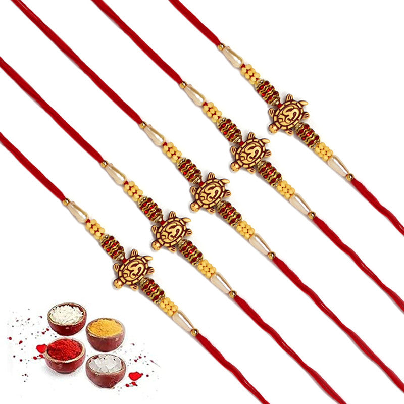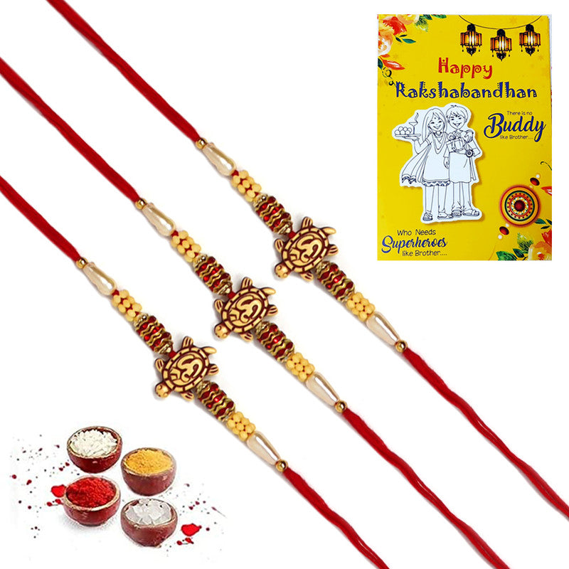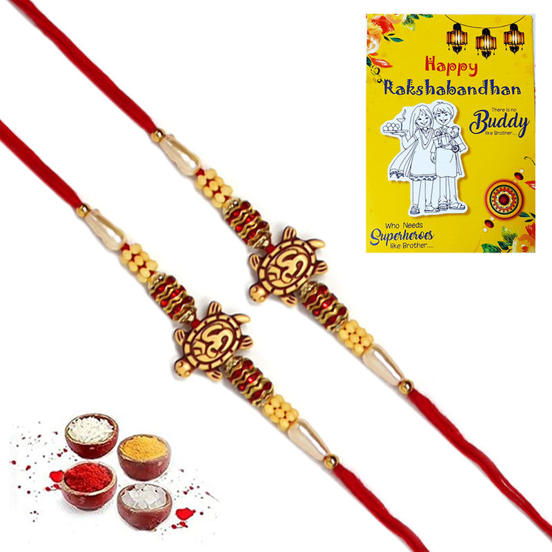 This unique Rakhi features a tortoise and OM design with red AD stones. It’s a beautiful and meaningful gift for your brother, perfect for the auspicious occasion of Raksha Bandhan.