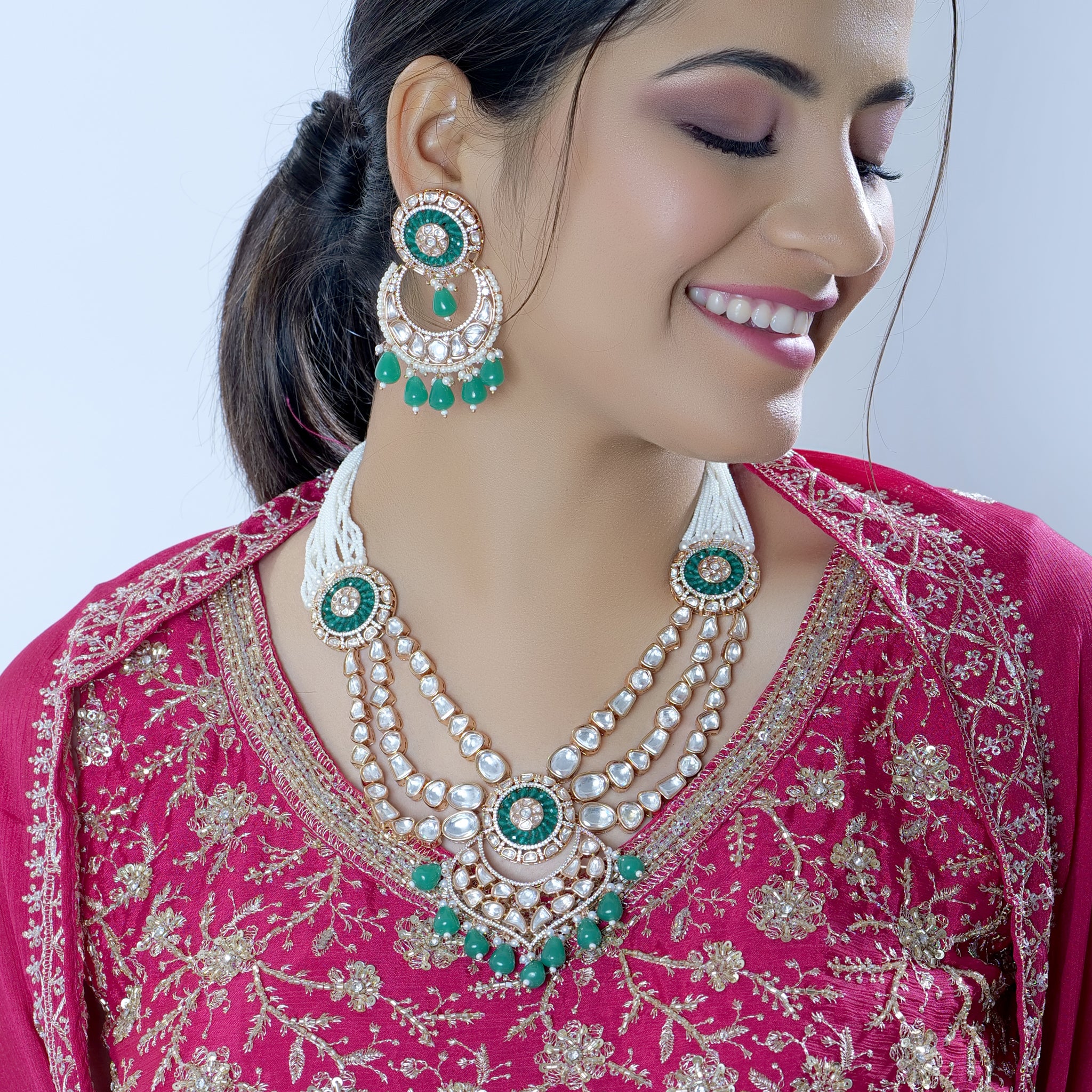 Traditional Three Layered Green Pearl Uncut Polki Kundan Jewelry Set