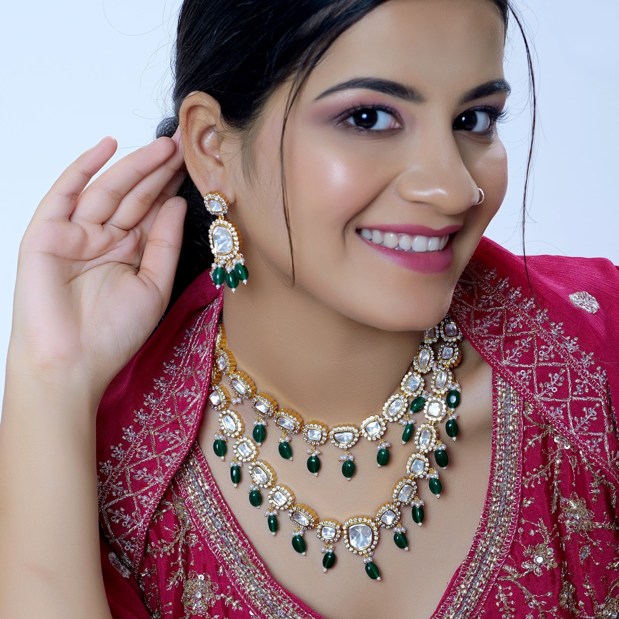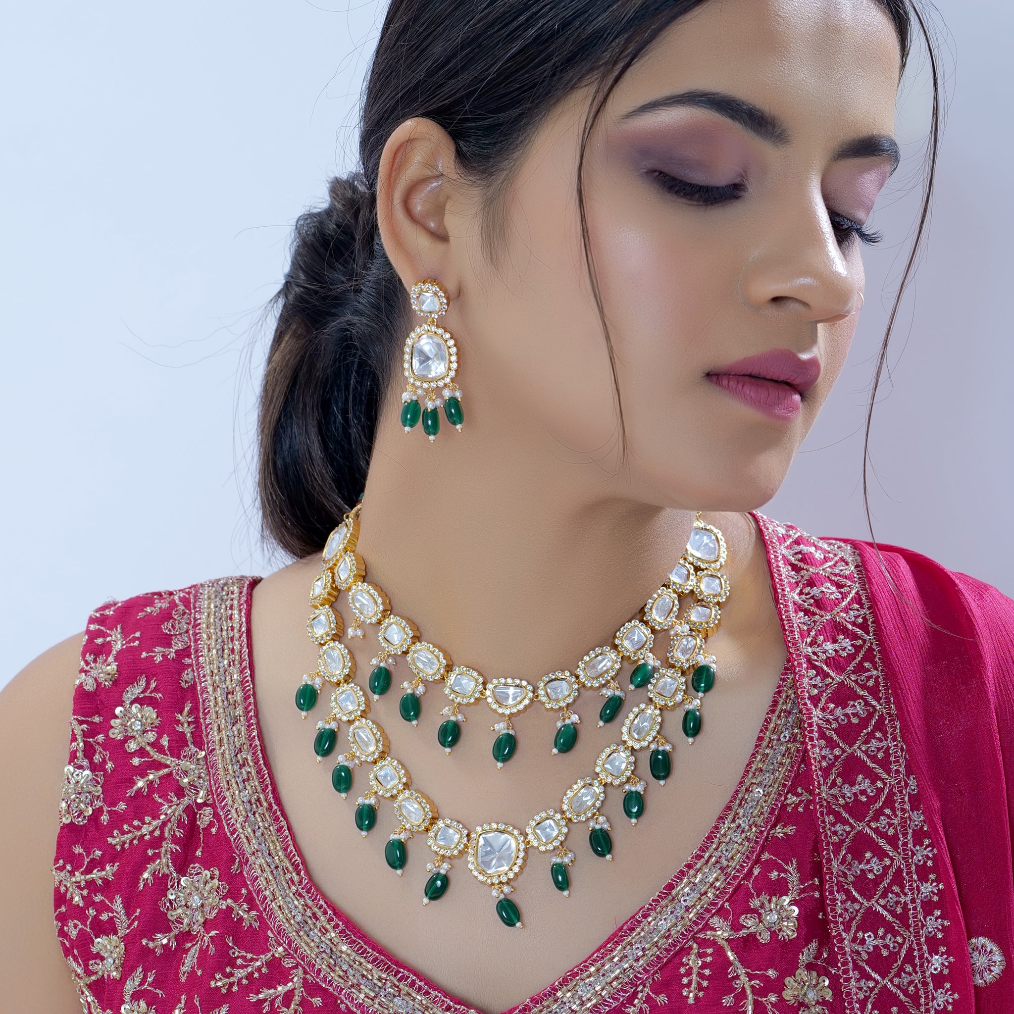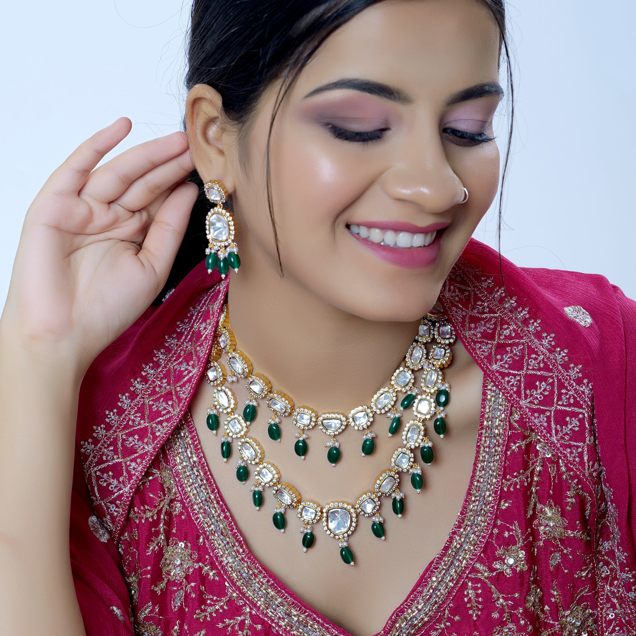 Two Layered Green Pearl CZ Studded Uncut Polki Kundan Jewelry Set