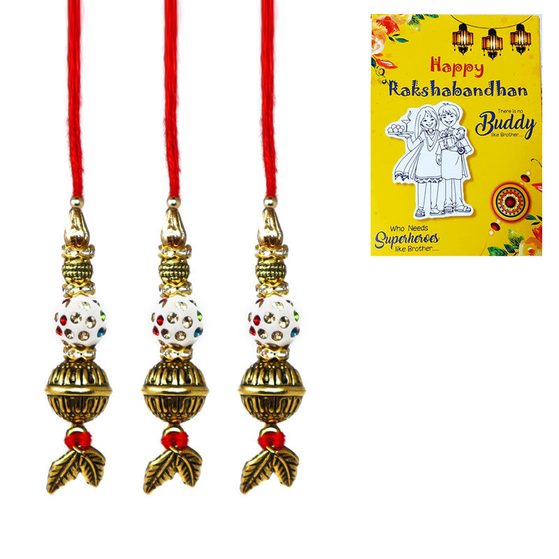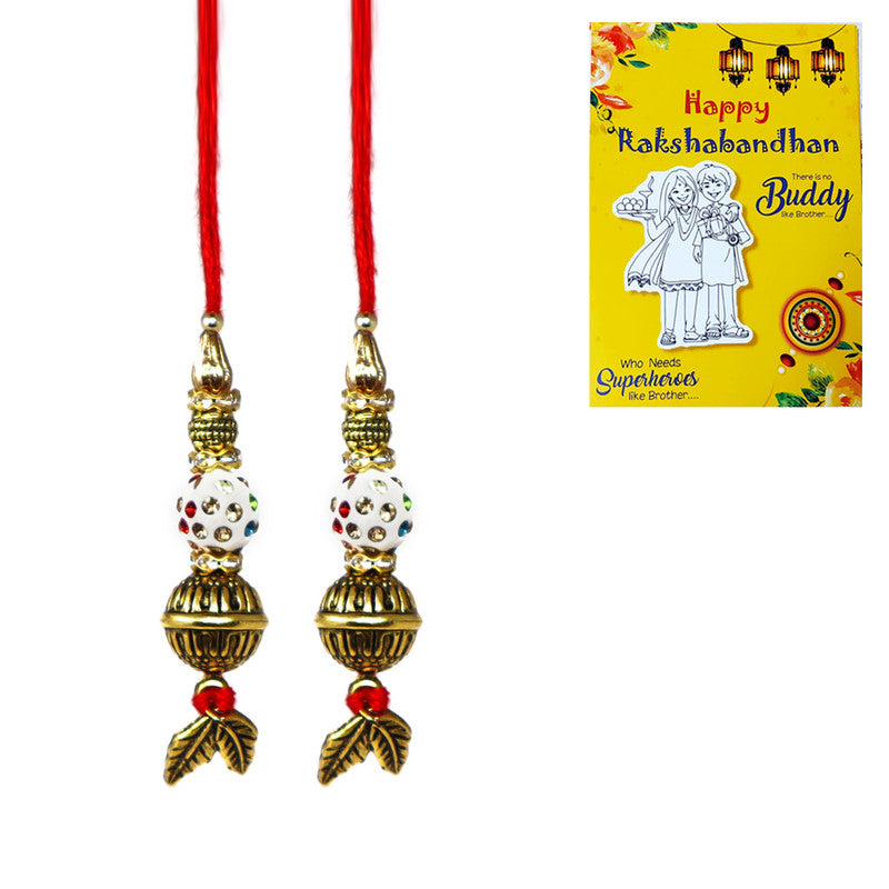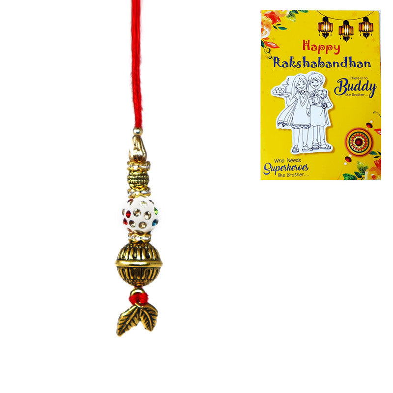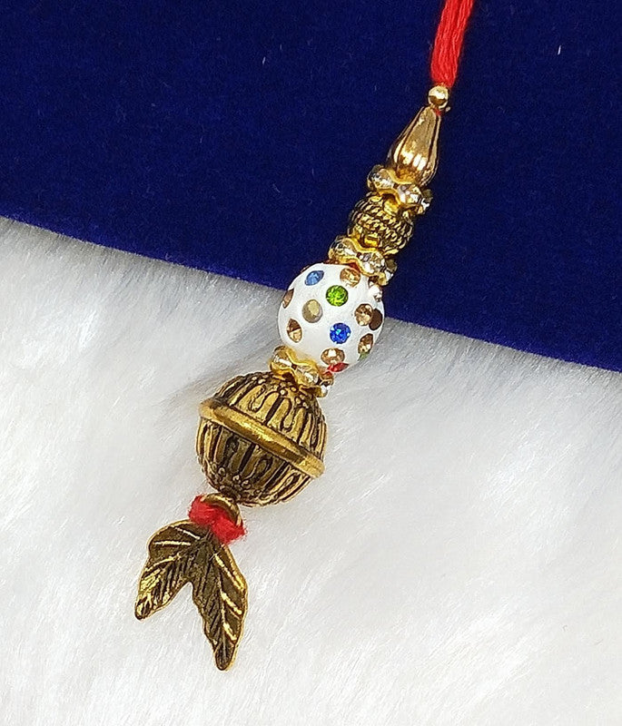 The White Zari Work Bhabhi Lumba Rakhi is a customized and designer Rakhi that showcases intricate, ethnic zari work. This elegant and minimalist Rakhi captures the essence of tradition while maintaining a sophisticated, modern appeal.